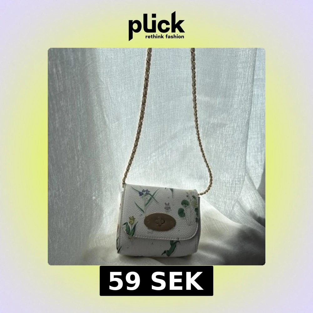Superfin liten axelväska i vitt med blommigt mönster och guldfärgad kedja. Väskan har ett snyggt vridlås i guld på framsidan och är perfekt för att lyfta vilken outfit som helst. Den är kompakt och smidig att bära med sig.