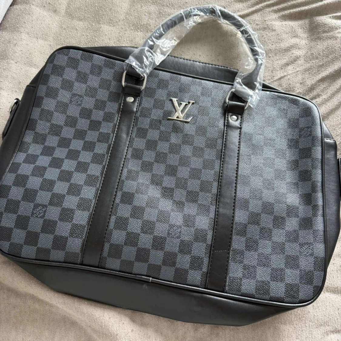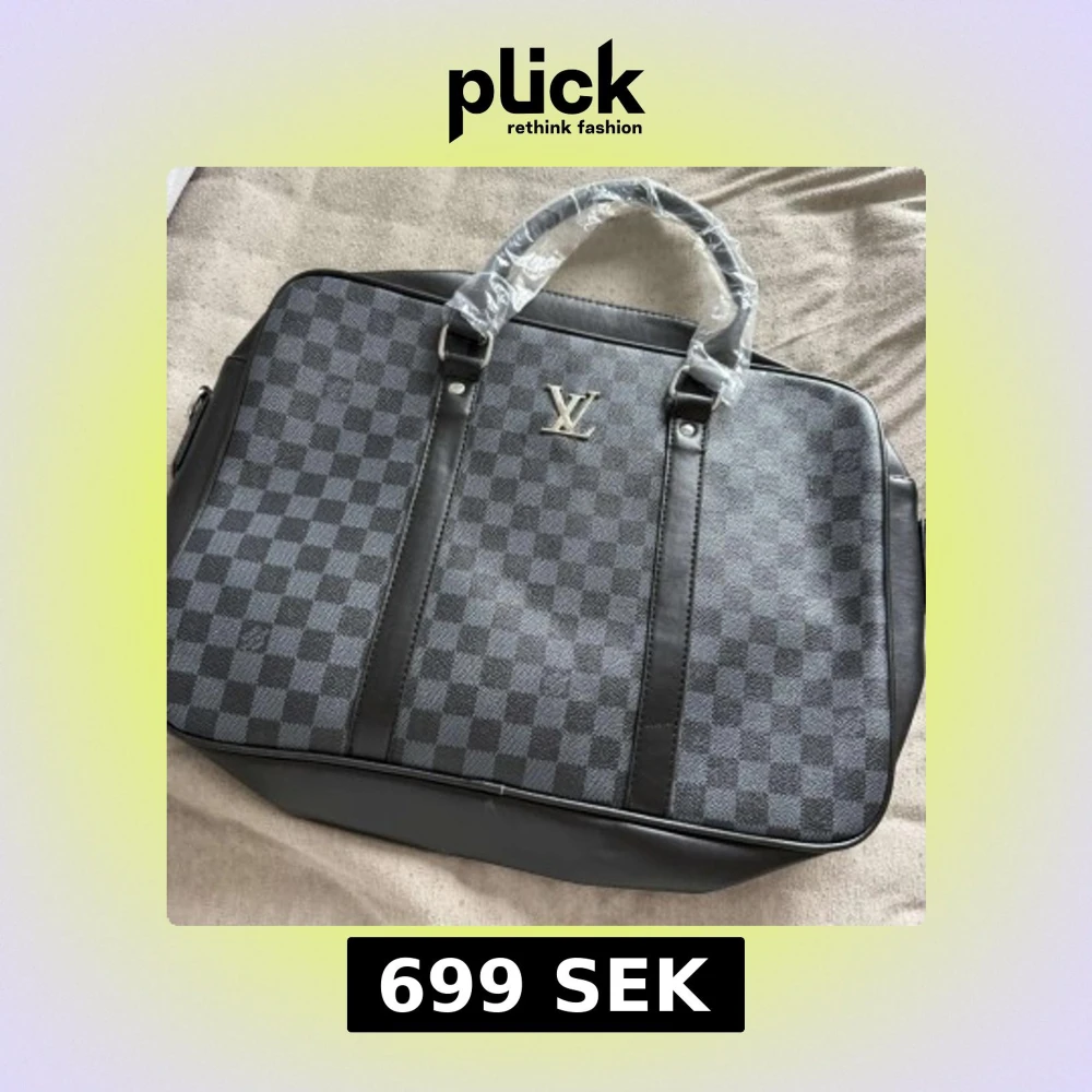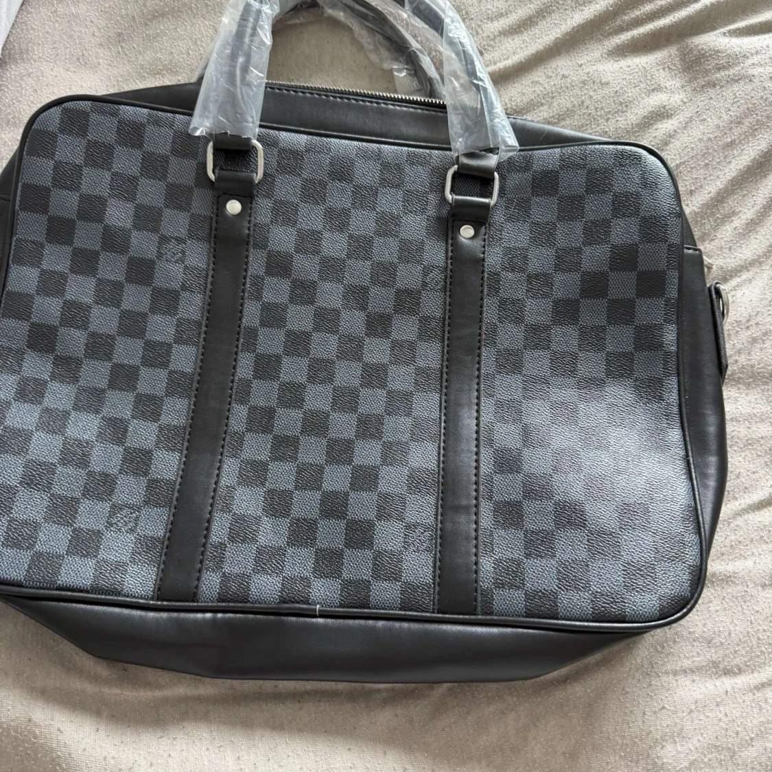 Snygg datorväska i svart och grått med klassiskt rutigt mönster. Väskan har silverfärgade detaljer, dubbla handtag och är tillverkad i skinn och syntet. Perfekt för att bära laptop och viktiga prylar med stil.
