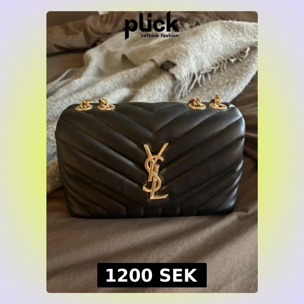 Säljer en stilren svart quiltad väska med guldkedja.