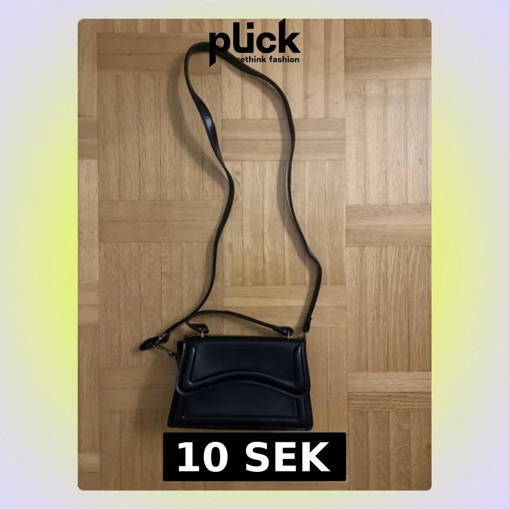Snygg svart axelväska med justerbar rem och guldfärgade metalldetaljer. Väskan har en stilren, boxig form och lock med diskret vågig detalj på framsidan. Perfekt för dig som vill ha en enkel men trendig accessoar till din outfit. Lite sönder vid sidan