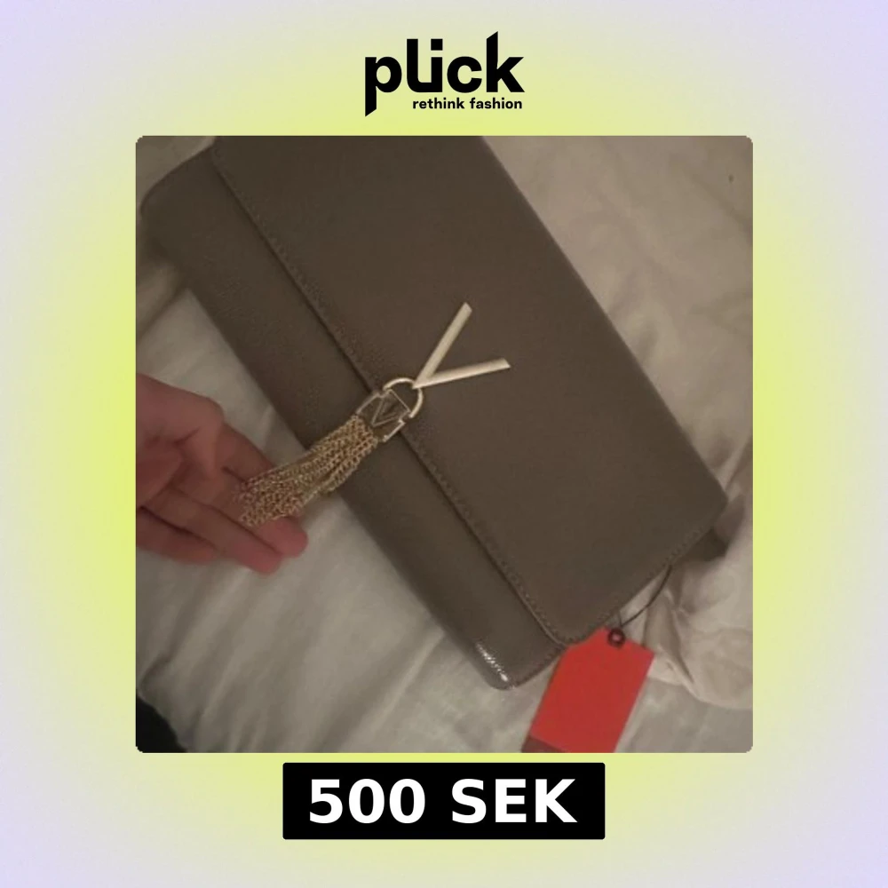 Elegant taupe kuvertväska från Mario Valentino med en stilren design. Väskan har en dekorativ tofsdetalj och en diskret logotyp på framsidan. Perfekt för att lyfta din outfit med en touch av lyx.