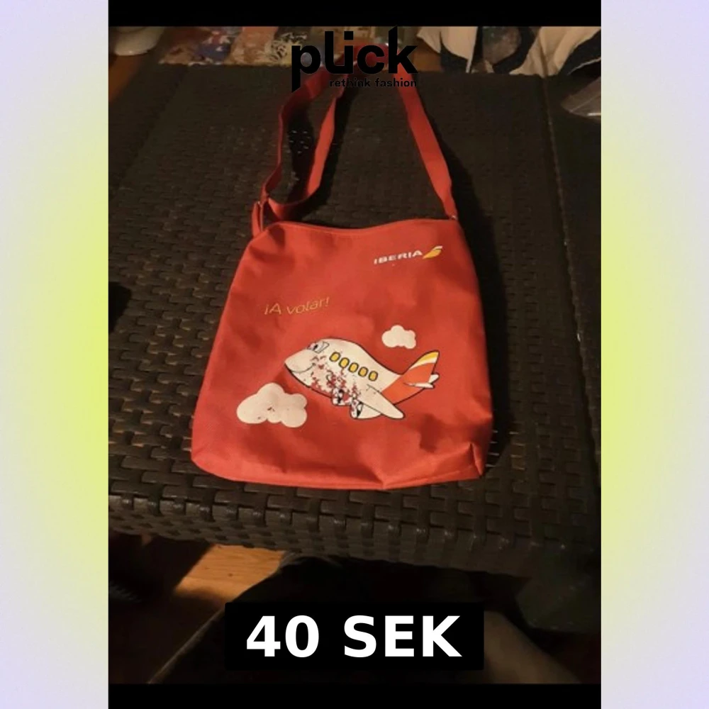 Säljer en röd axelväska från Iberia med ett gulligt flygplansmotiv och texten '¡A volar!' på framsidan. Väskan har ett långt axelband och är tillverkad i slitstark polyester. Perfekt för dig som gillar färgglada och unika accessoarer.
