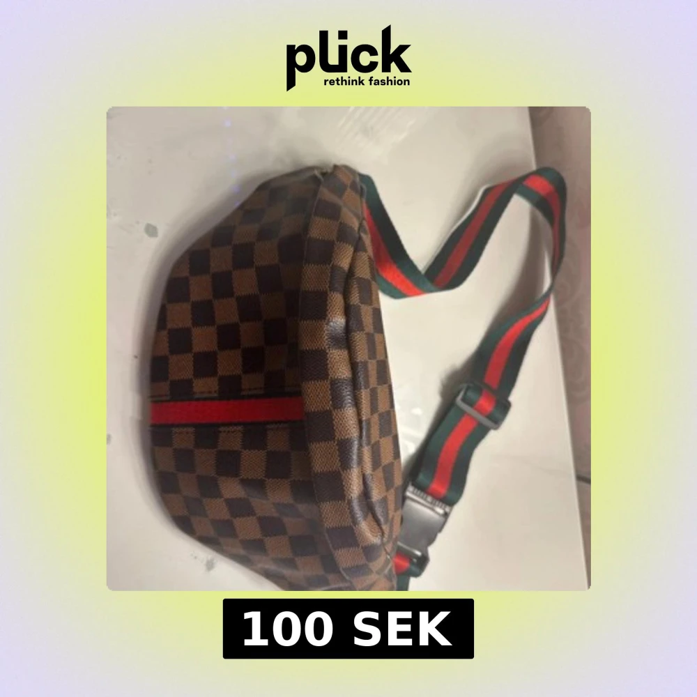Snygg magväska i brunt och svart rutigt mönster med justerbar rem i grönt och rött. Väskan har dragkedja och är tillverkad i ett syntetmaterial med slät yta. Perfekt för att bära det viktigaste när du är på språng.
