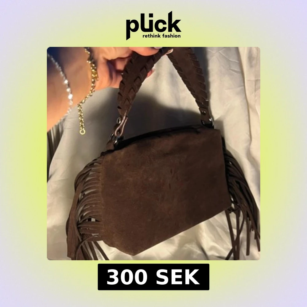 Snygg brun handväska i mocka med flätat handtag och långa fransar på sidorna. Väskan har en rektangulär form och cool western-vibe. Perfekt för dig som vill sticka ut med detaljer och mjukt material.