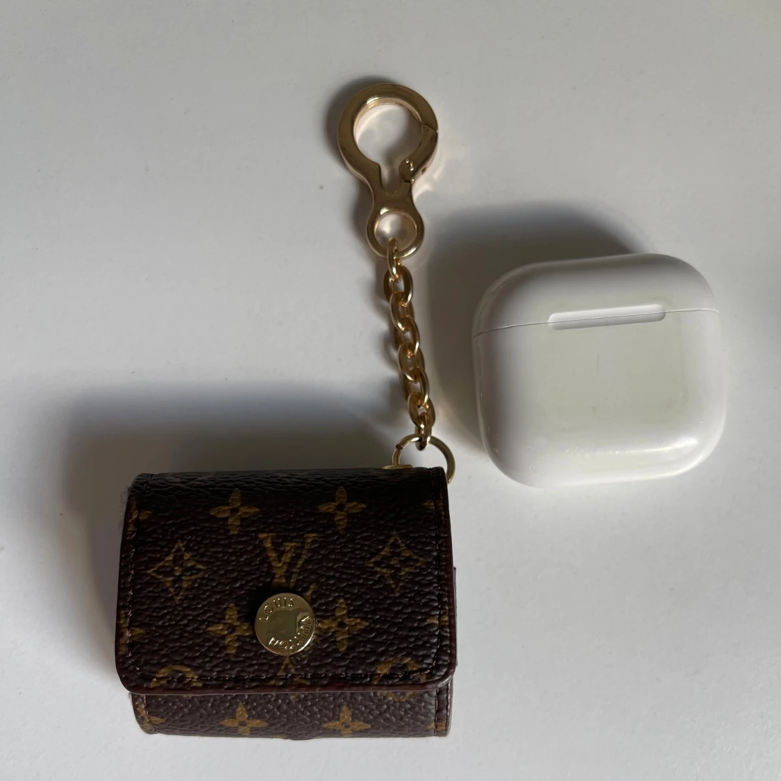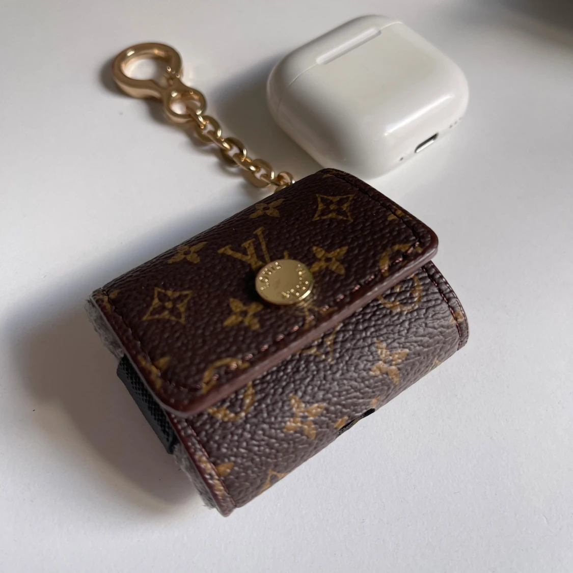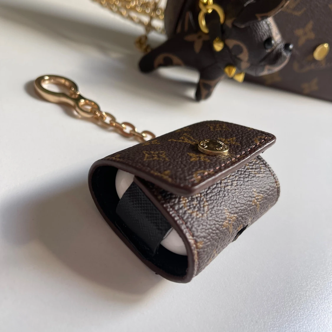 Snygg liten hörlursväska från i klassiskt brunt monogrammönster med guldfärgad och knapp. Perfekt för AirPods eller småsaker, tillverkad i skinn med exklusiv känsla och ikoniska -detaljer. Supersmidig att fästa på väskan eller nyckelringen.