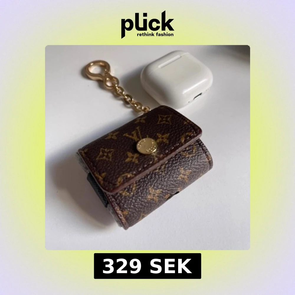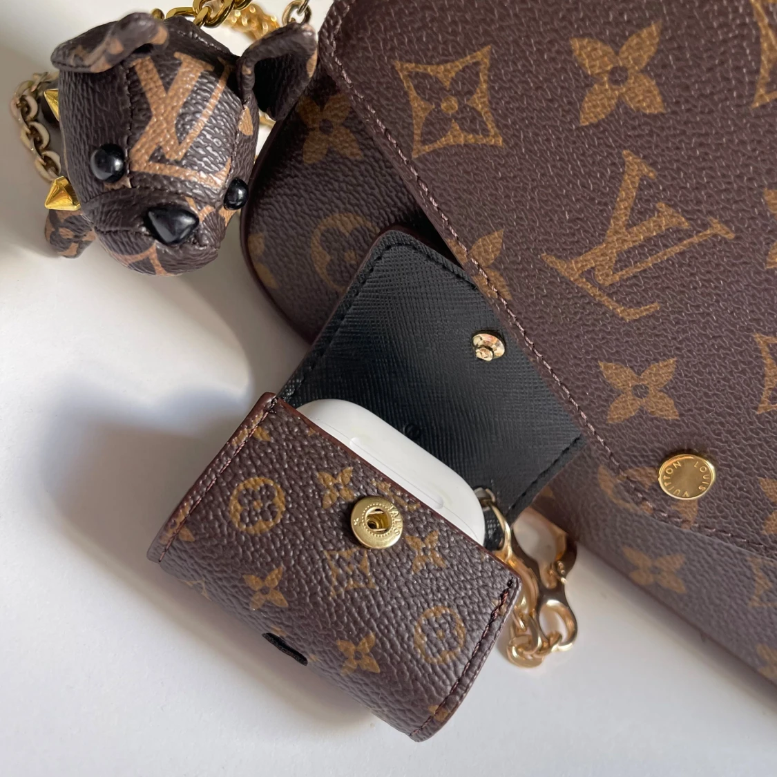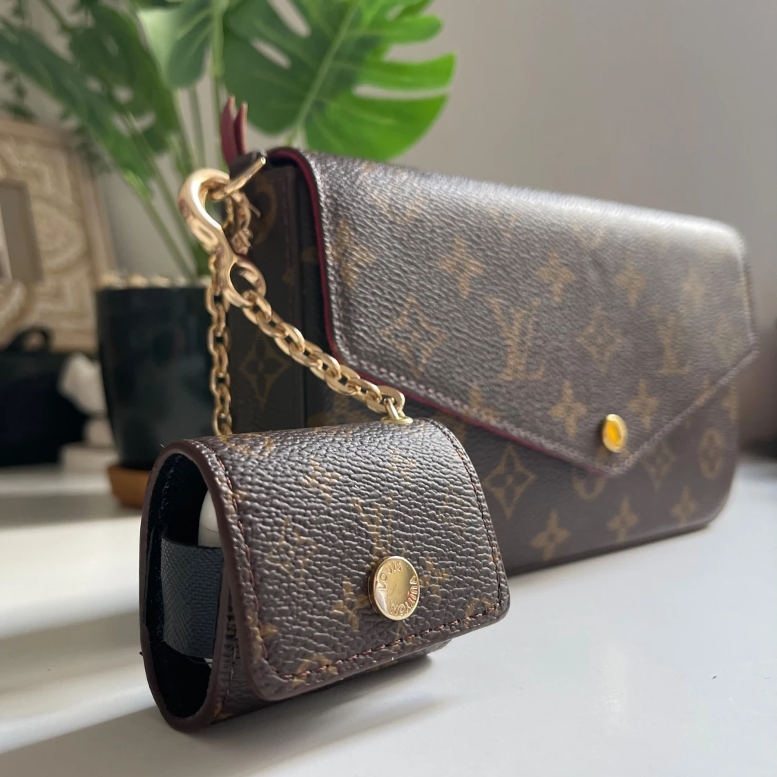 Snygg liten hörlursväska från i klassiskt brunt monogrammönster med guldfärgad och knapp. Perfekt för AirPods eller småsaker, tillverkad i skinn med exklusiv känsla och ikoniska -detaljer. Supersmidig att fästa på väskan eller nyckelringen.