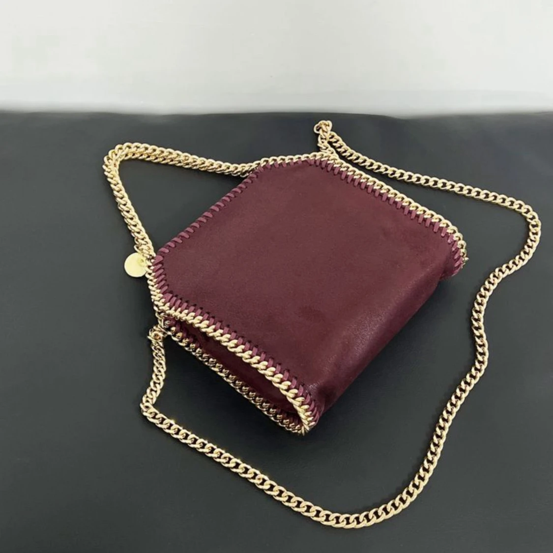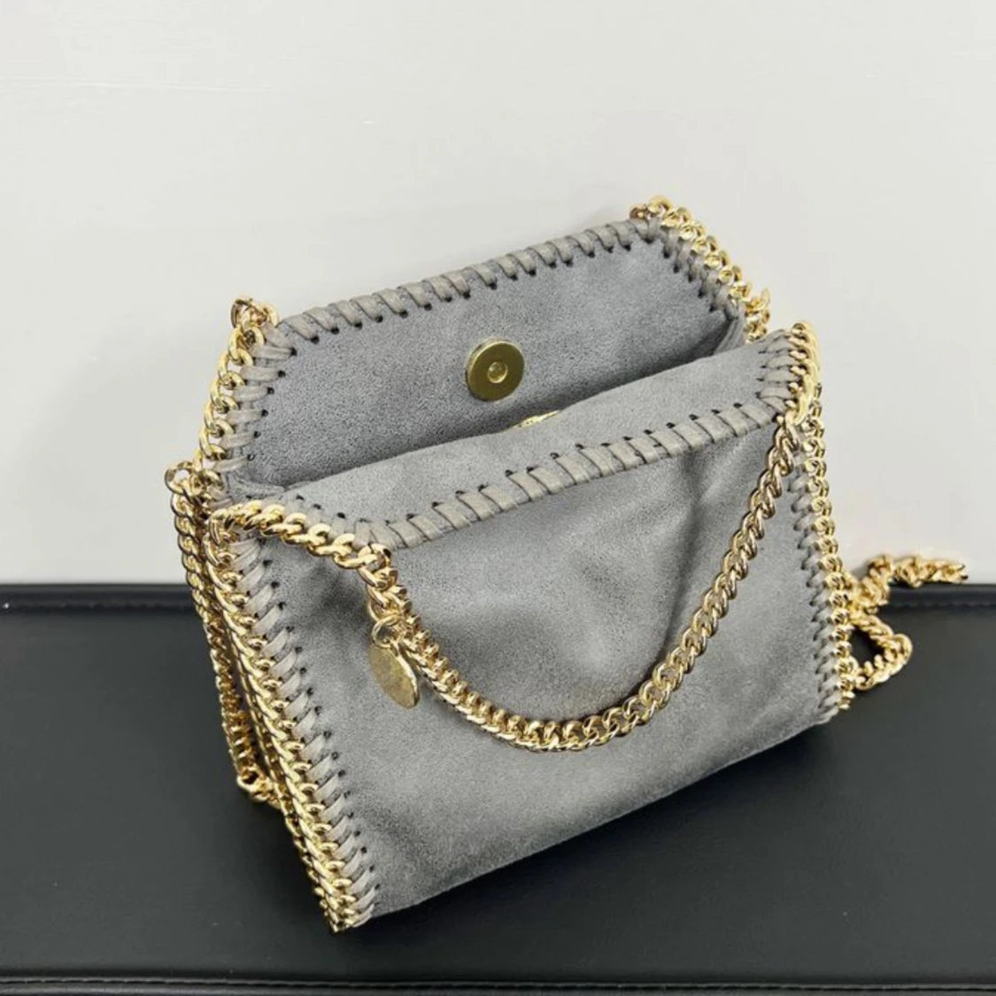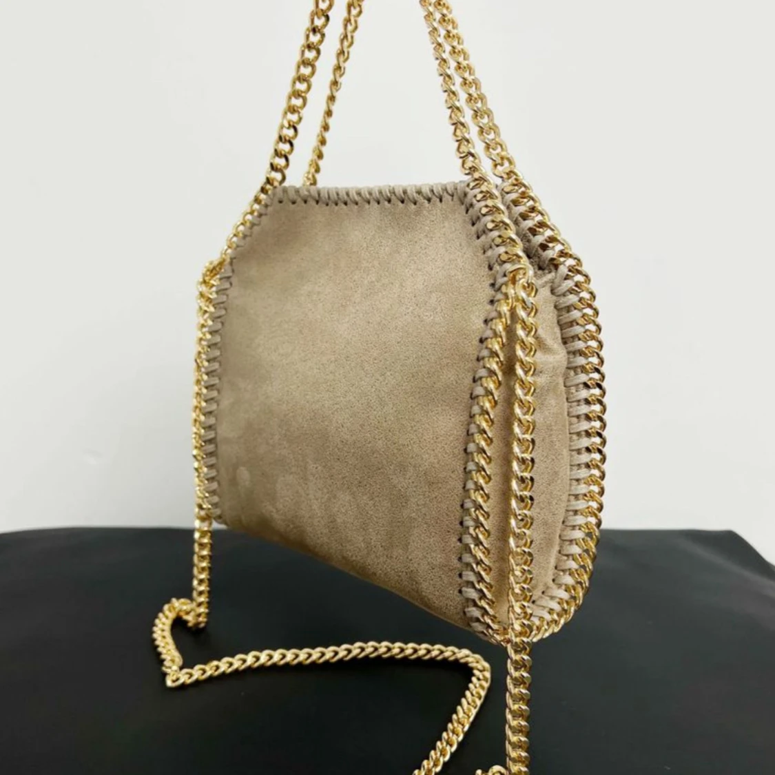 Snygg axelväska i mjuk mocka med guldfärgad kedja runt kanterna och som axelrem. Finns i svart, grå, beige och vinröd. Väskan har en unik form och stängs med magnetknapp. Perfekt för dig som vill ha en trendig accessoar med lyxig känsla.