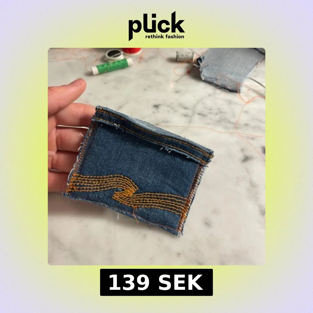 Unik plånbok sydd av återvunnen blå denim med klassiska orangea sömmar. Perfekt för kort och smågrejer, med coolt jeansmönster och råa kanter som ger en chill vibe. Liten och smidig att ha med sig överallt.