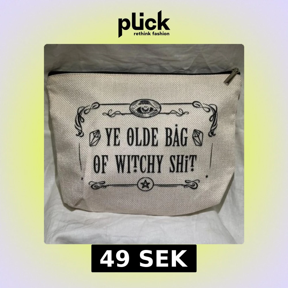 Ny! Säljer en beige necessär med texten 'Ye Olde Bag of Witchy Shit' i svart. Väskan har en dragkedja upptill och är perfekt för att förvara småsaker. Den har en stilren design med dekorativa detaljer runt texten. Text på båda sidor. Kika gärna på mina andra annonser har massor att sälja 🌸