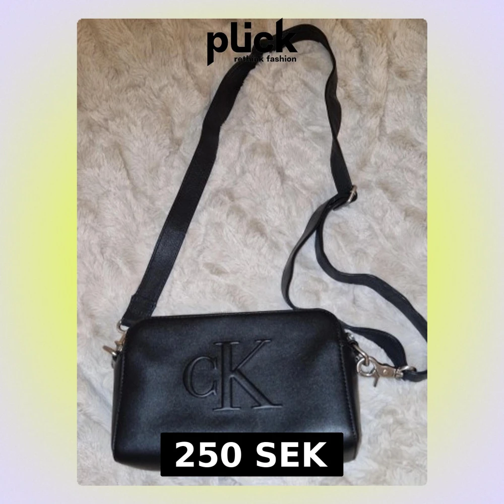 Säljer en stilren svart axelväska från Calvin Klein med präglad CK-logga på framsidan. Väskan har justerbar axelrem i skinn och silverfärgade metalldetaljer. Perfekt storlek för det viktigaste och enkel att matcha med olika outfits.