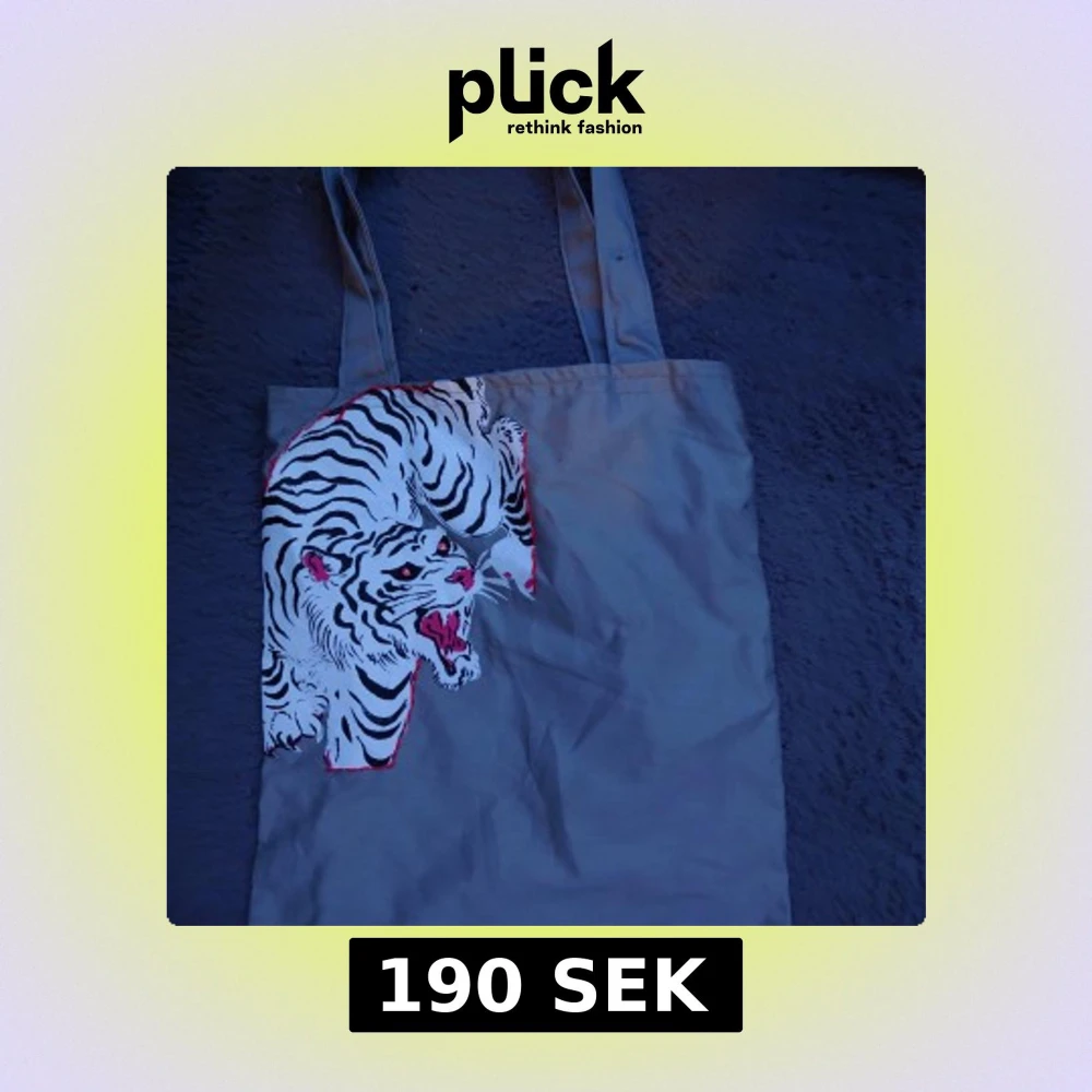 Handgjord grå tygväska med ett målat tryck av en vit tiger. Inte alls använd, den är i toppen skick.