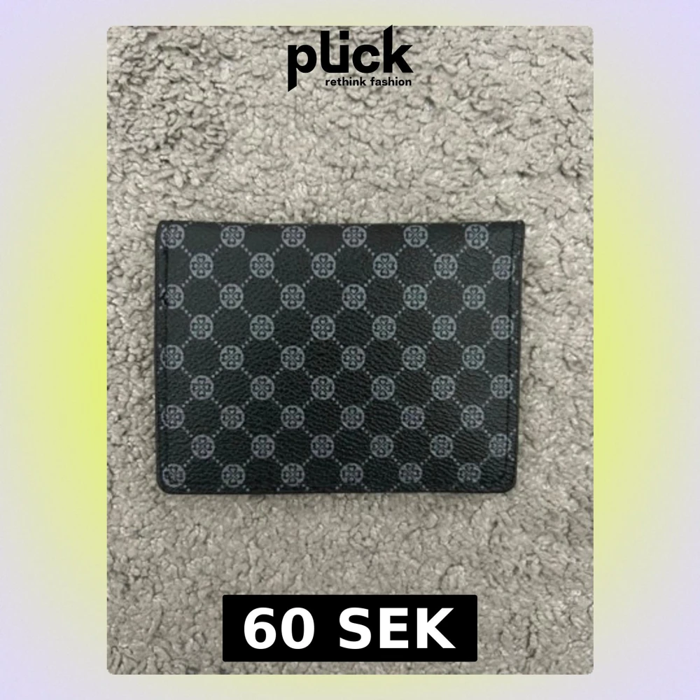 Stilren svart plånbok med diskret mönster i grått. Plånboken har flera kortfack, ett fönsterfack och stängs med tryckknapp. Tillverkad i tåligt skinn med en klassisk, rektangulär form. Perfekt för dig som gillar snygga detaljer och praktisk design.