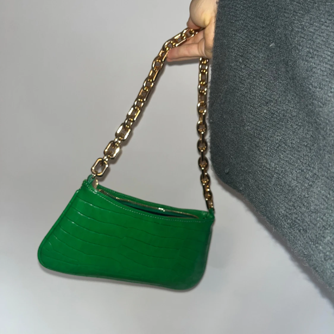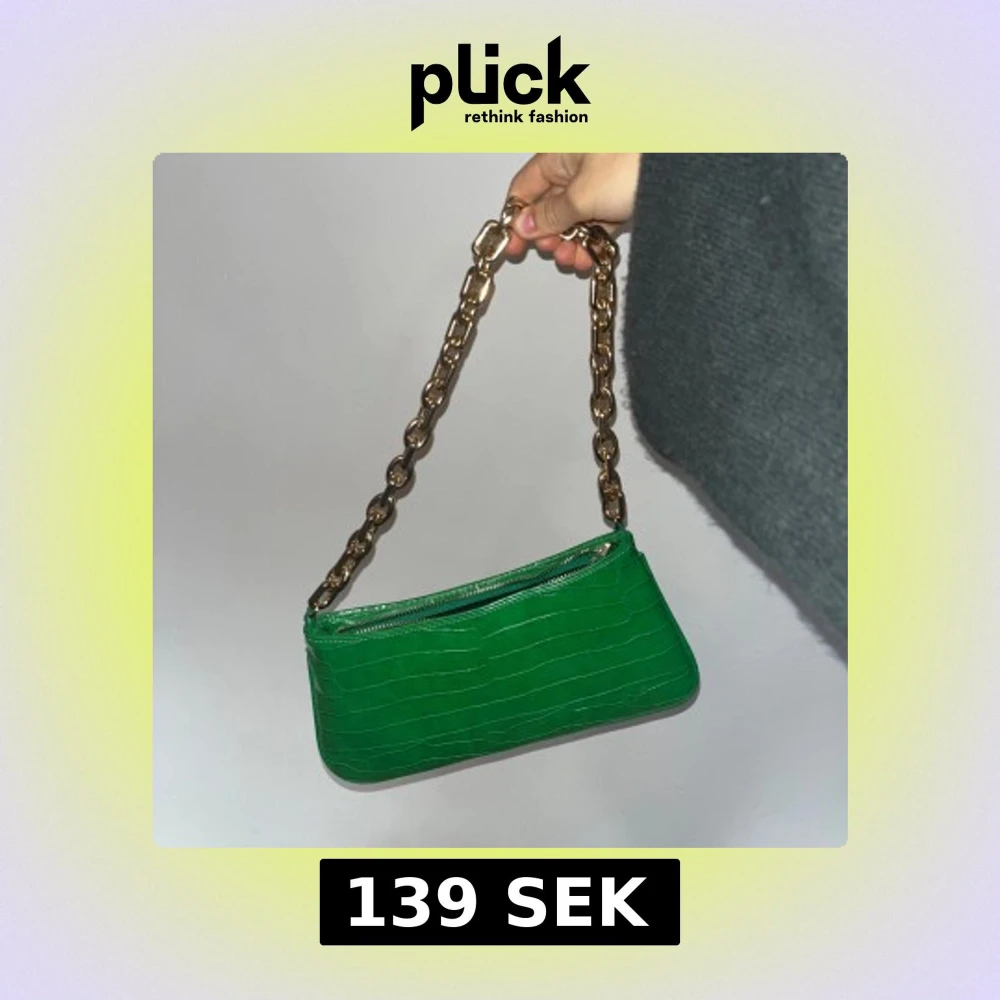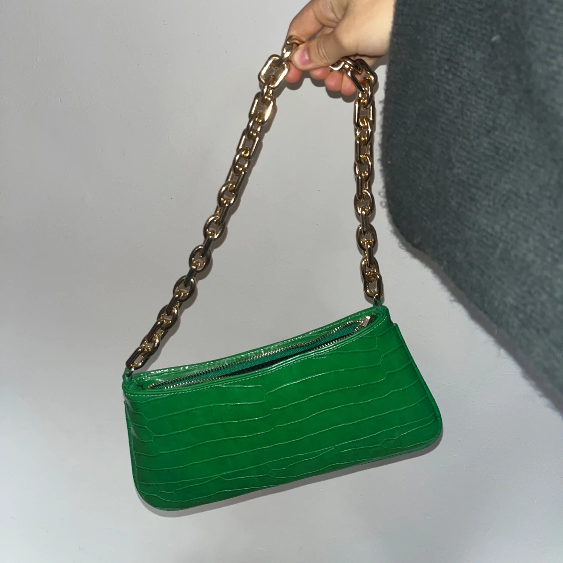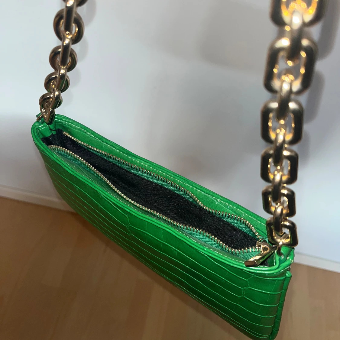 Snygg grön axelväska i croco-mönstrad syntet med chunky guldfärgad kedja som axelrem. Väskan har dragkedja upptill och en stilren, avlång form som ger en trendig vibe. Perfekt för dig som vill sticka ut med färg och coola detaljer.💕💕💕😃😃