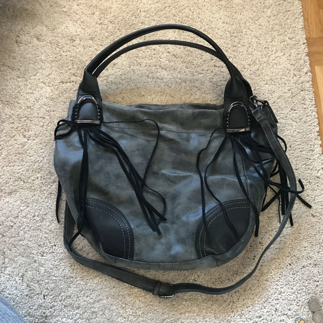 Väska med 1 ytterfack och 4 innerfack + delning i mitten, använd kanske 2 eller 3 gånger. En liten skada på ena remmens fäste, syns på bild 3 Obs! Finns spår av katthår i fodret