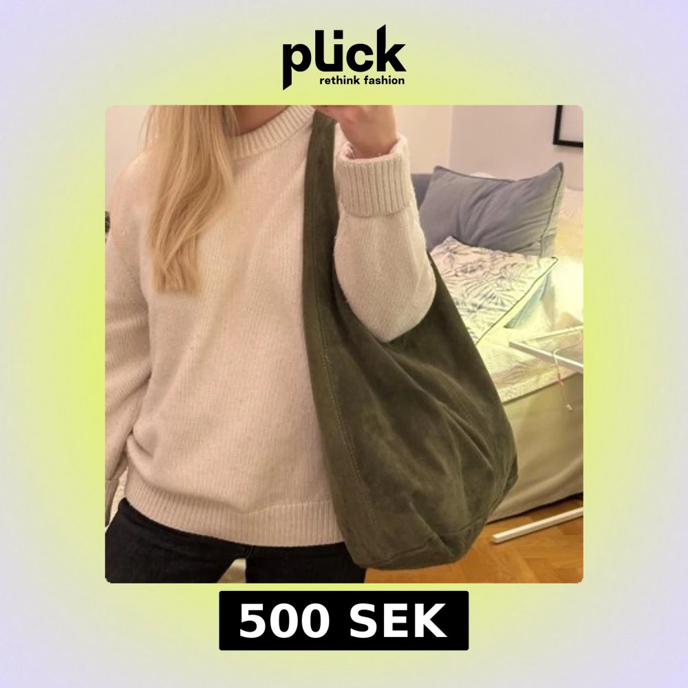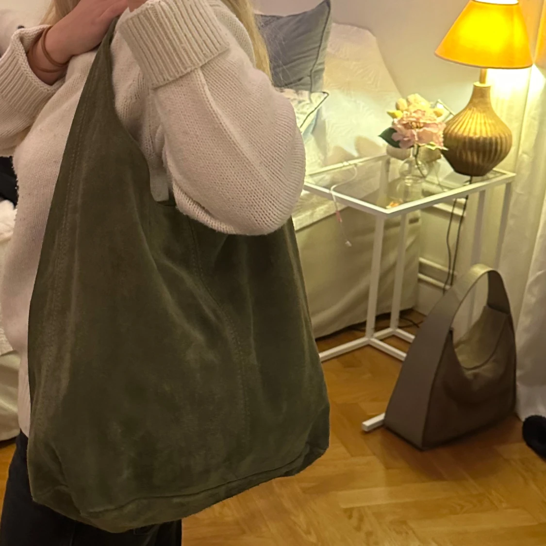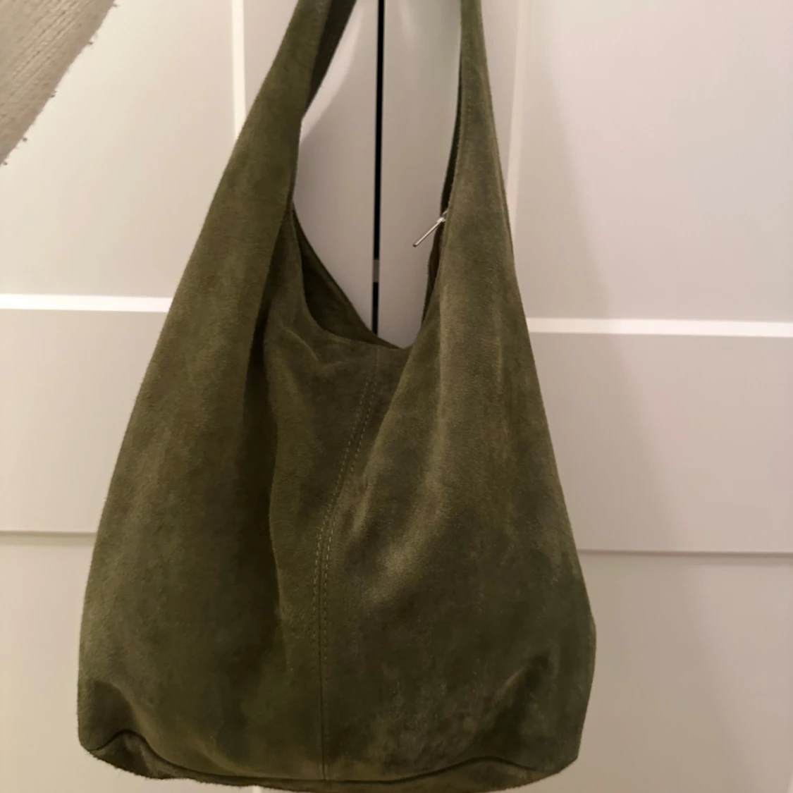 Sjukt najs olivgrön axelväska i äkta mocka. Väskan har en enkel design med en bred axelrem som gör den bekväm att bära. Perfekt för att rymma alla dina vardagliga nödvändigheter.