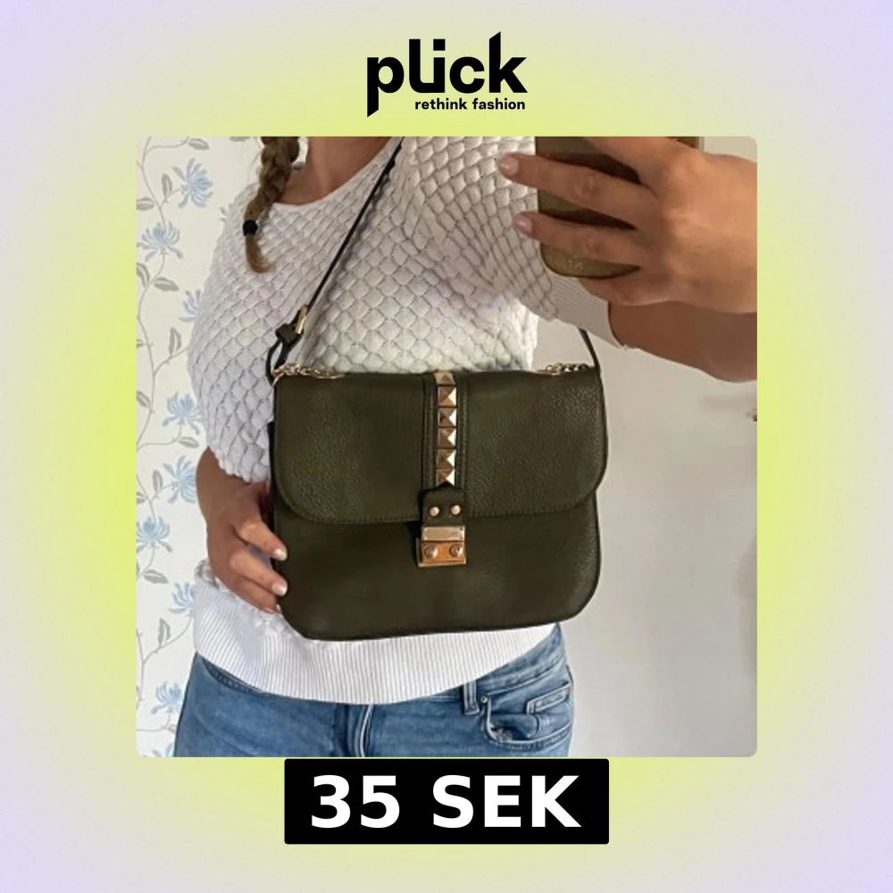 Mörk olivgrön väska som har guldiga detaljer. Mycket bra skick utan låset som hoppar/ funkar inte ibland därav så billig. Ska gå att fixa. Har ett långt axelband som jag brukar göra kort som på bilden