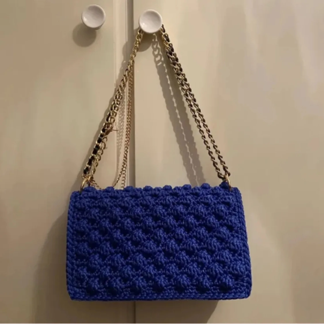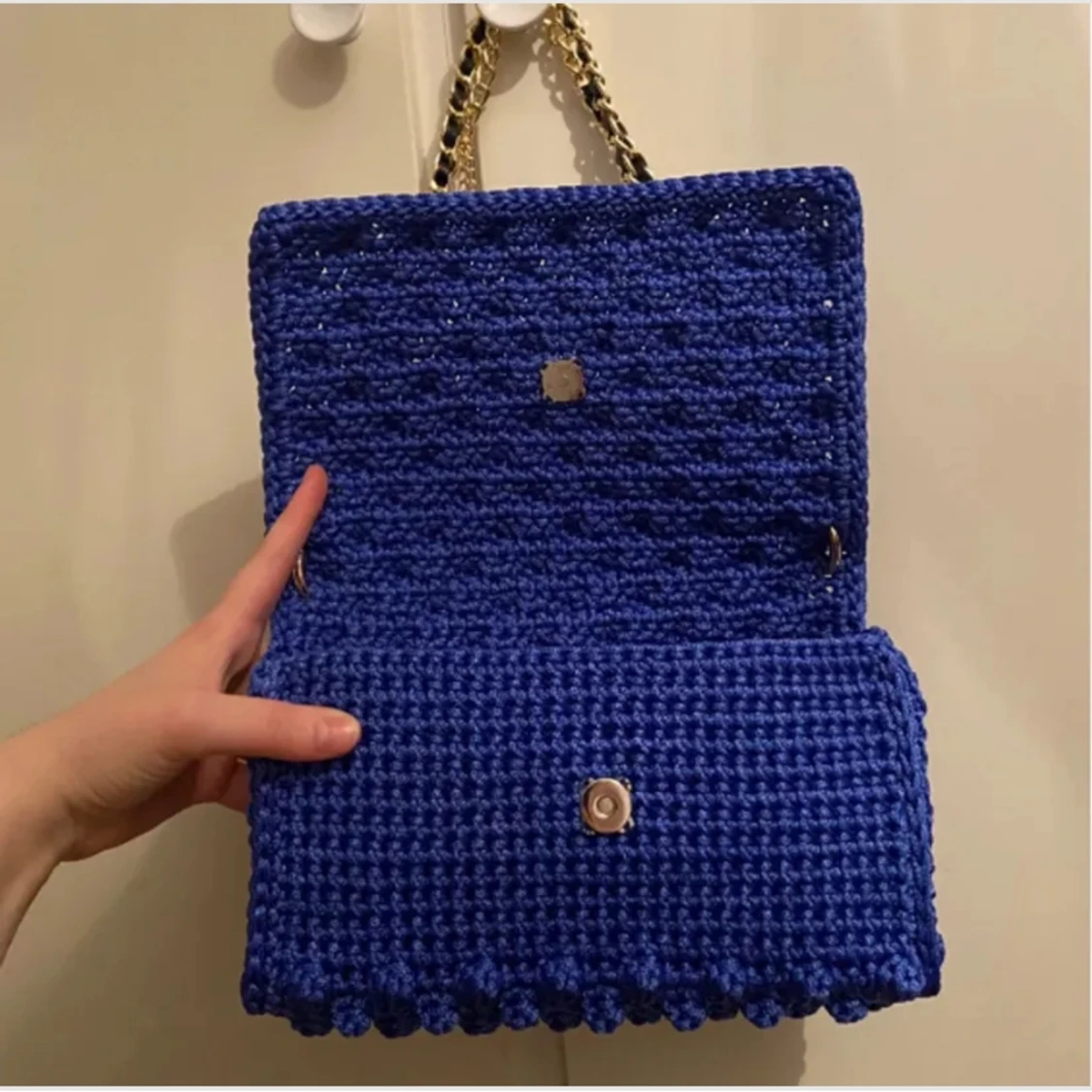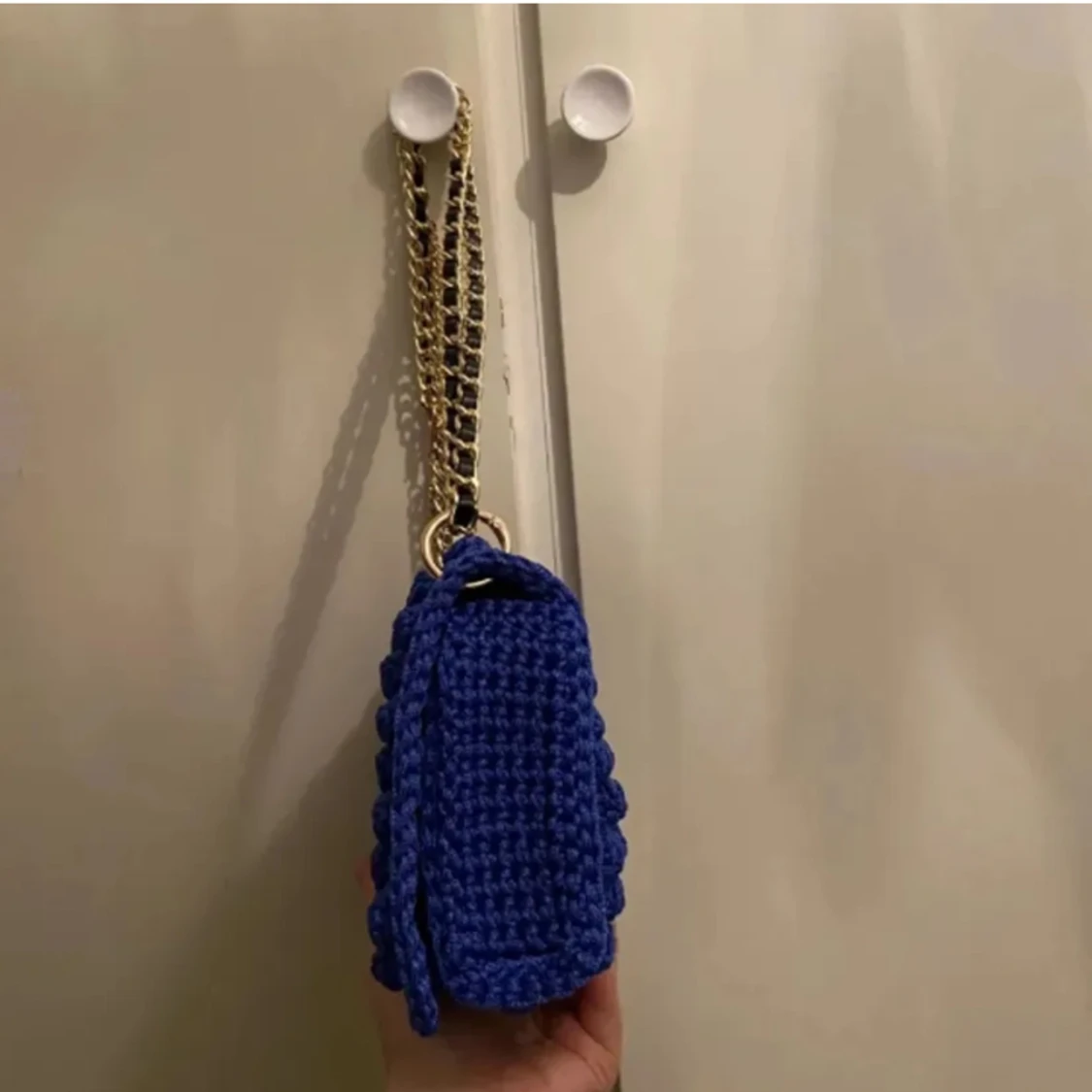 Virkad väska i royalblå, i bubbelformat. Garnet är gjort på "hård polyester". Stängs igen med hjälp av en tryckmagnet. Ej fodrad! Mått: längd: 25.5cm höjd: 15.5cm djup: 4cm Frakt tillkommer♥️ OBS! Katter finns i hemmet