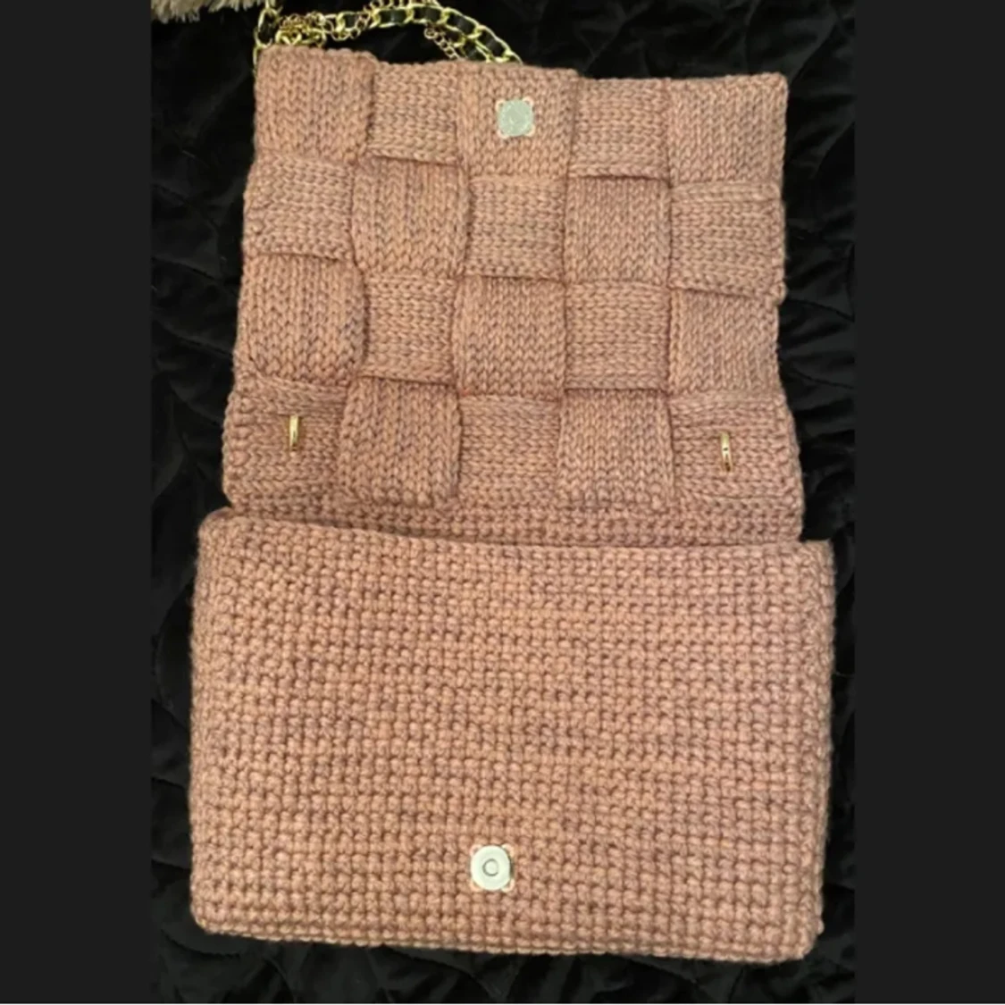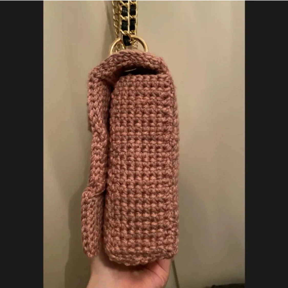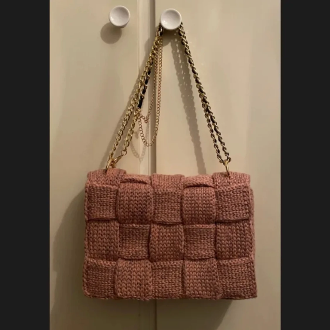 Virkad väska i fin "dusty pink" färg, virkad på dubbeltråd. Väskan stängs igen med ett magnetiskt knäppe. MATERIAL: 1 tråd akryl+ 1 tråd bomull MÅTT: längd:27cm, höjd:19,5cm & djup:5,5cm OBS! Katter finns i hushållet!