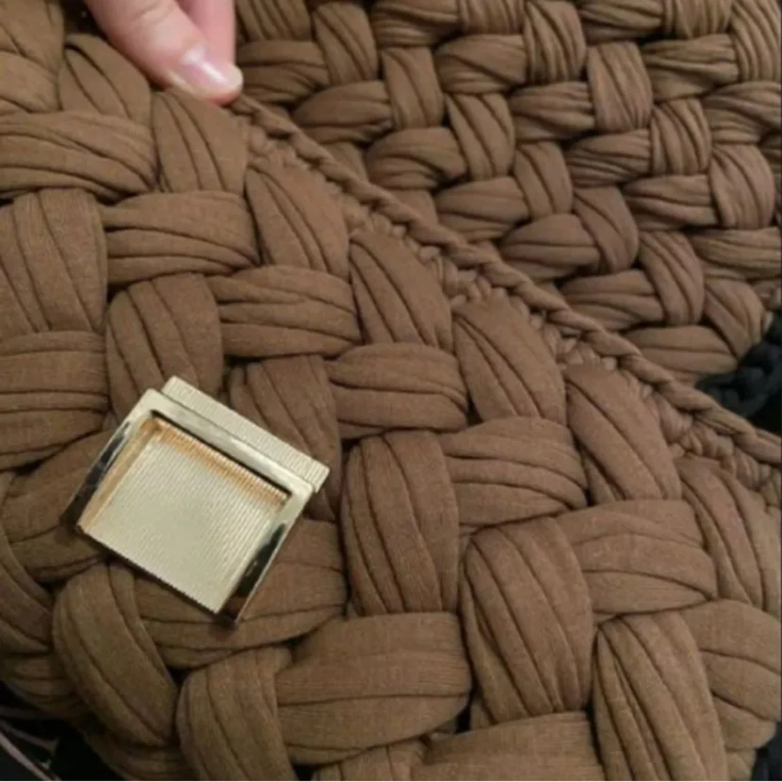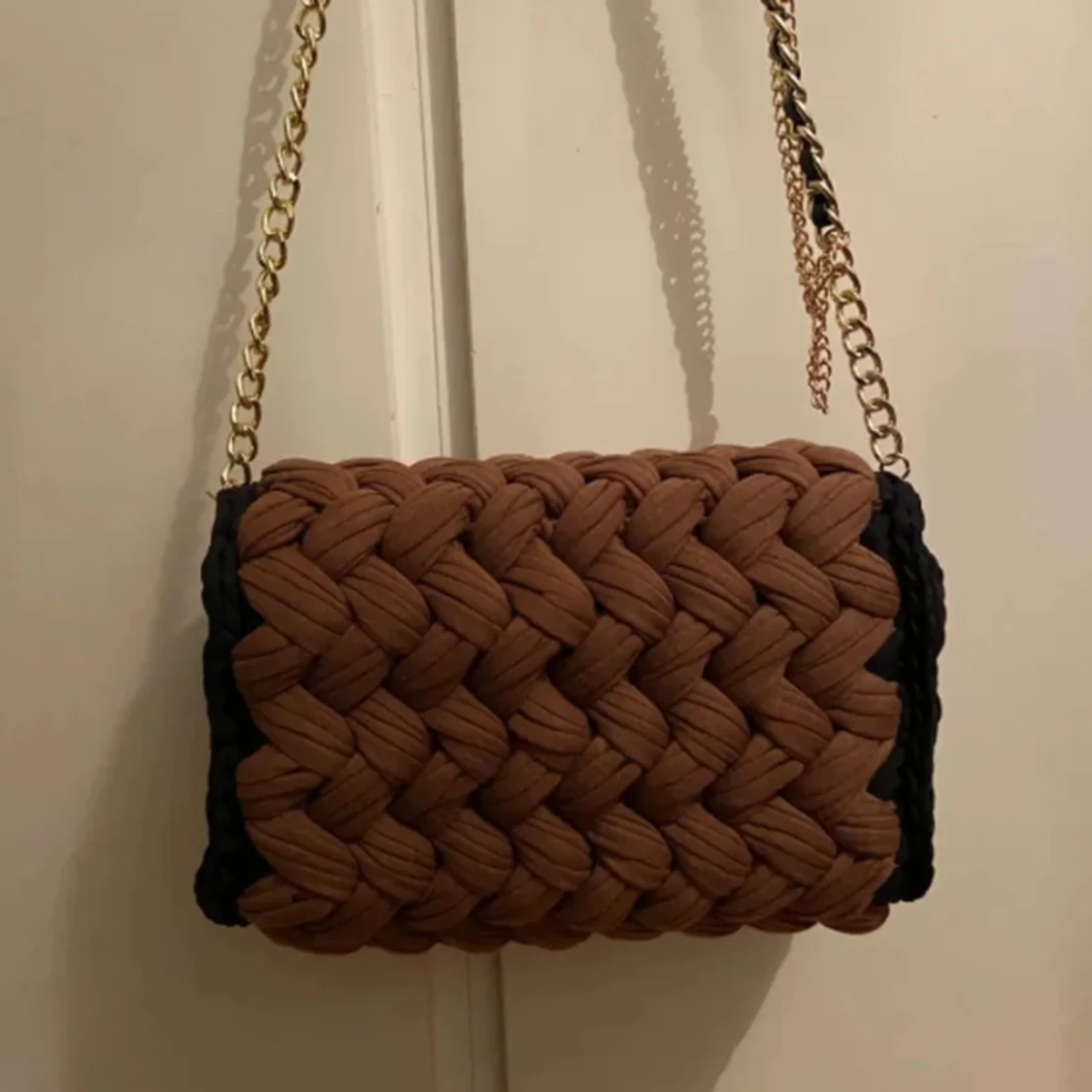 Brun väska med svarta kanter och sidor. Väskan är smyckad med guldfärgade detaljer - guldkedja med svart fakeskin och ett guldfärgat lås. längd: 24.5 cm höjd: 17 cm bredd: 6.5 cm. OBS!! Katt finns i hushållet