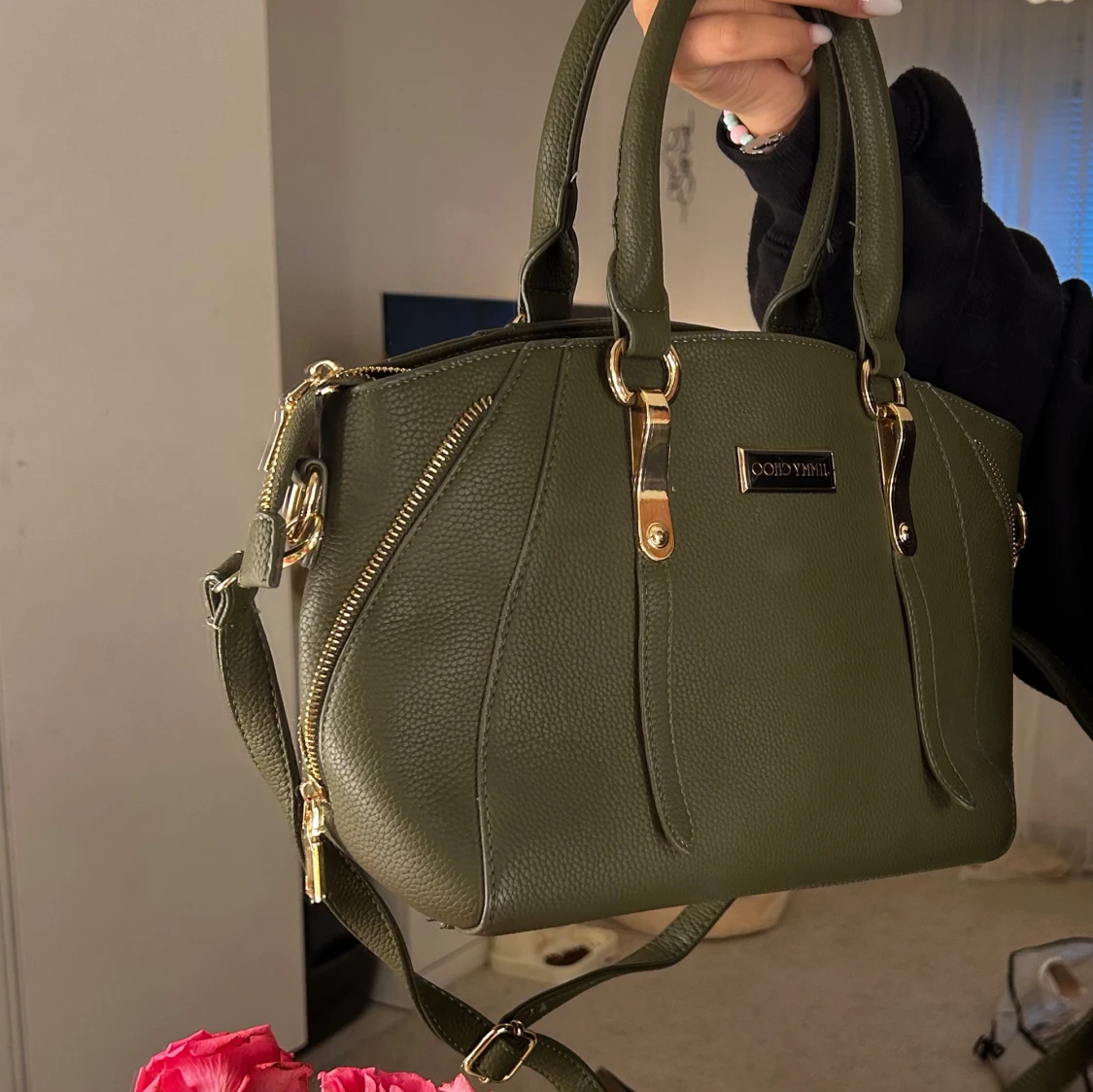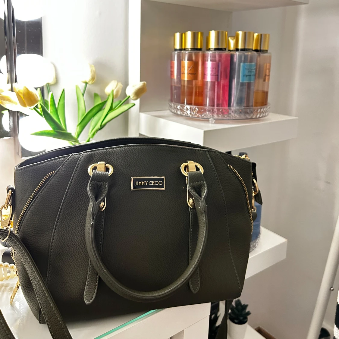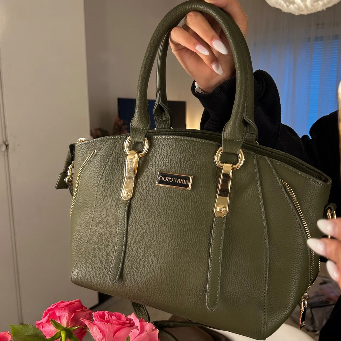 Snygg olivgrön handväska från Jimmy Choo med guldfärgade metalldetaljer och dragkedjor. Väskan har både handtag och axelrem, samt flera fack med dragkedja. Tillverkad i strukturerat skinnliknande material och har en stilren, modern form.