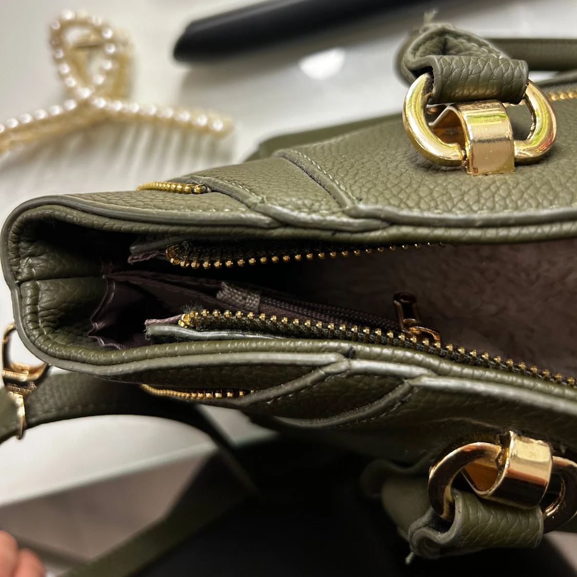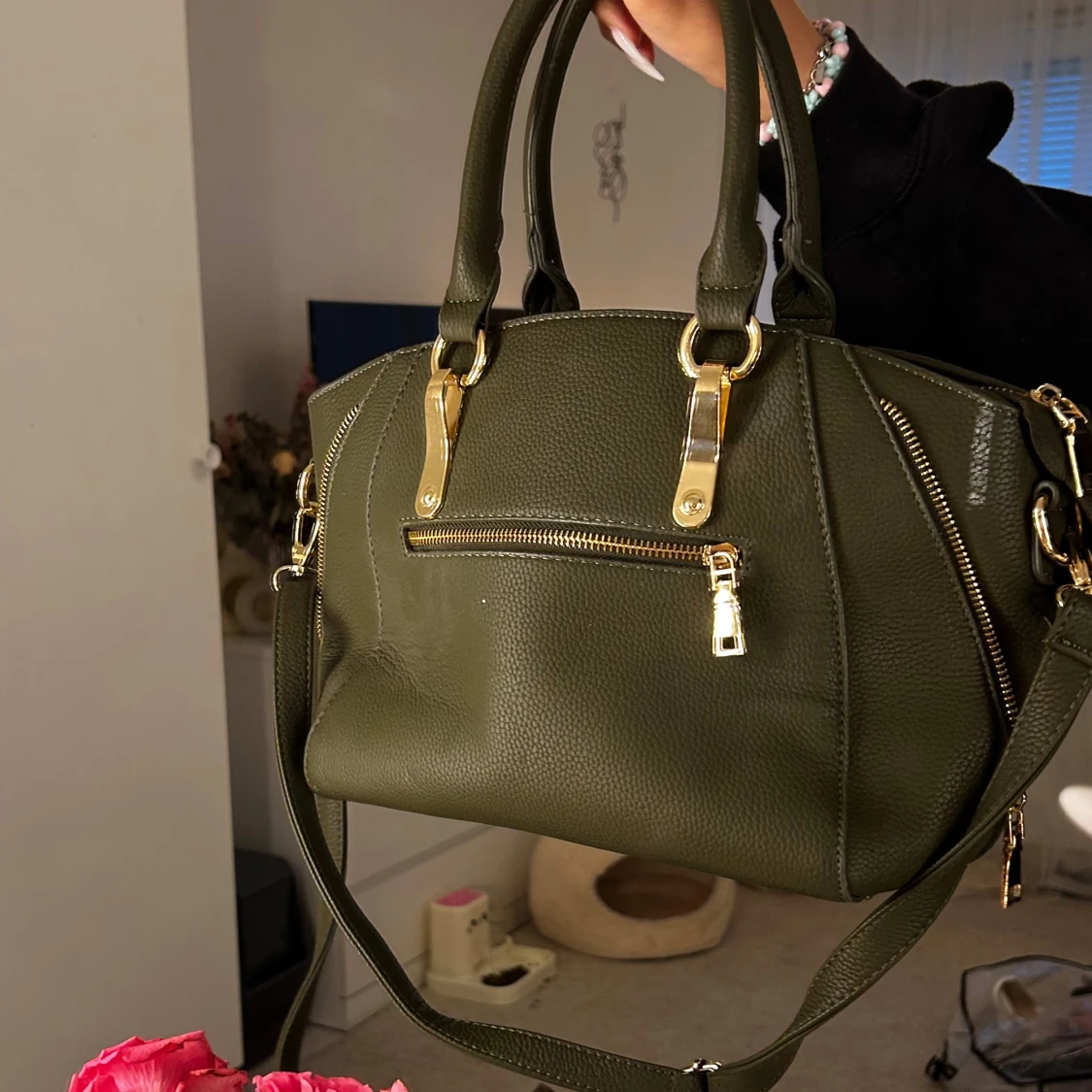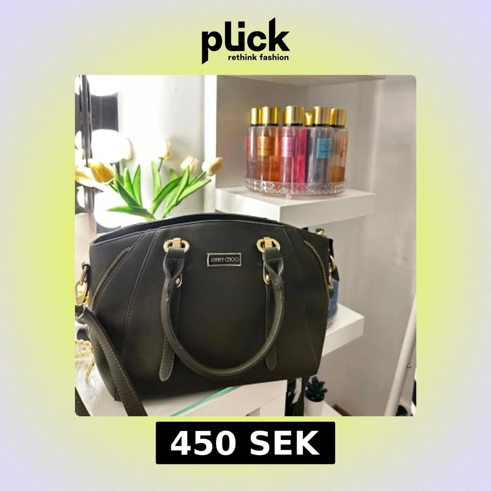 Snygg olivgrön handväska från Jimmy Choo med guldfärgade metalldetaljer och dragkedjor. Väskan har både handtag och axelrem, samt flera fack med dragkedja. Tillverkad i strukturerat skinnliknande material och har en stilren, modern form.