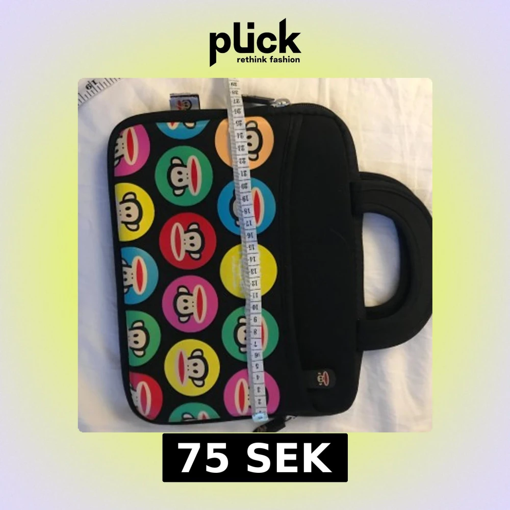 Säljer en cool datorväska med ett färgglatt mönster av apor i cirklar. Väskan har ett handtag och dragkedja för enkel användning. Perfekt för att bära din laptop med stil!