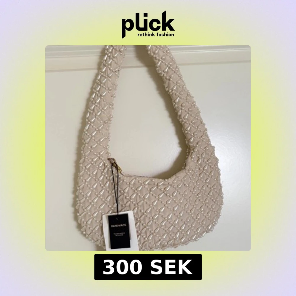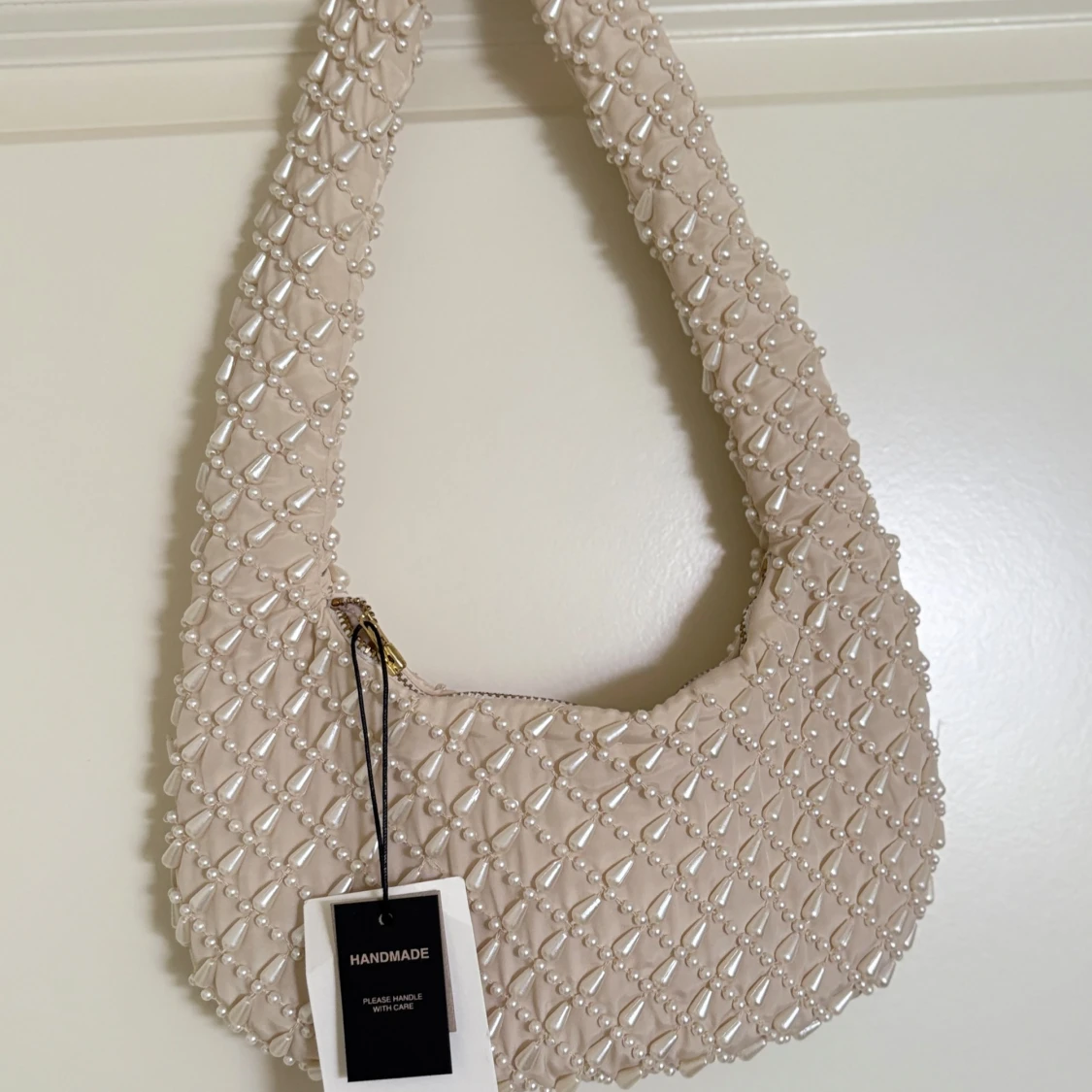 Superfin beige axelväska från AP Pearls, täckt med glansiga pärlor i ett rutmönster. Väskan har en mjuk, rundad form och stängs med dragkedja. Perfekt för att lyfta vilken outfit som helst med en lyxig touch.