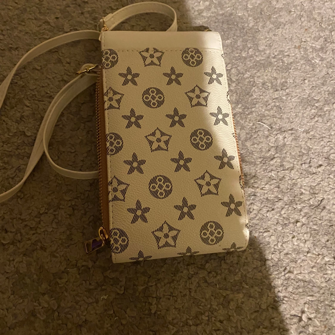 En liten vit axelväska med ett mönster av stjärnor och cirklar. Väskan har en dragkedja och en klaff med ett guldfärgat lås. Den har en justerbar axelrem.