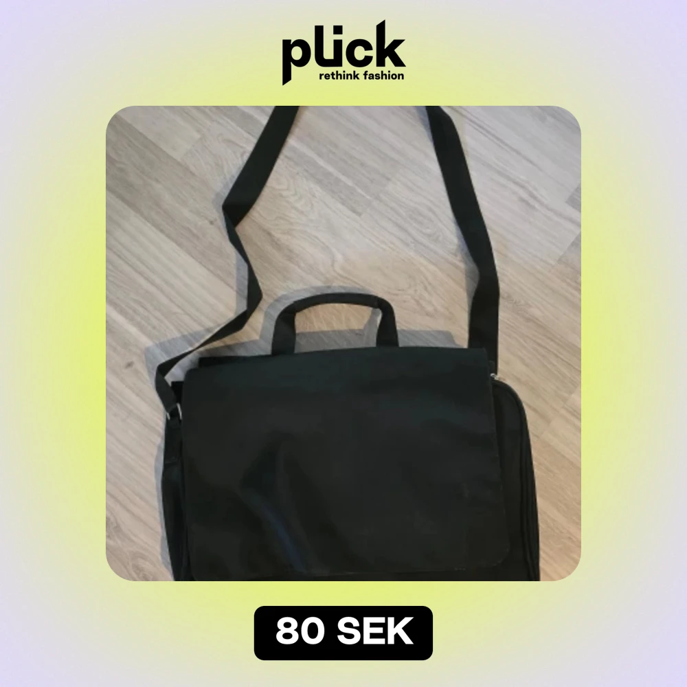 Säljer en praktisk svart datorväska med justerbar axelrem. Väskan har flera fack och kan öppnas från både framsida och baksida. Perfekt för att bära med sig laptop och andra viktiga saker till jobbet eller skolan.