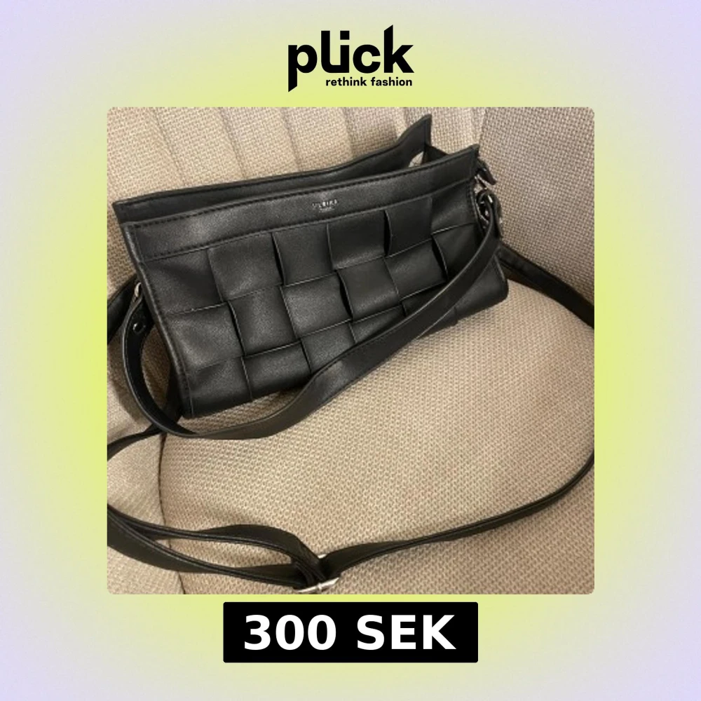 Svart handväska från Ulrika Sweden. Ett kort avtagbart band och ett långt justerbart band tillkommer. Väskan har lite fläckar i innerfodret