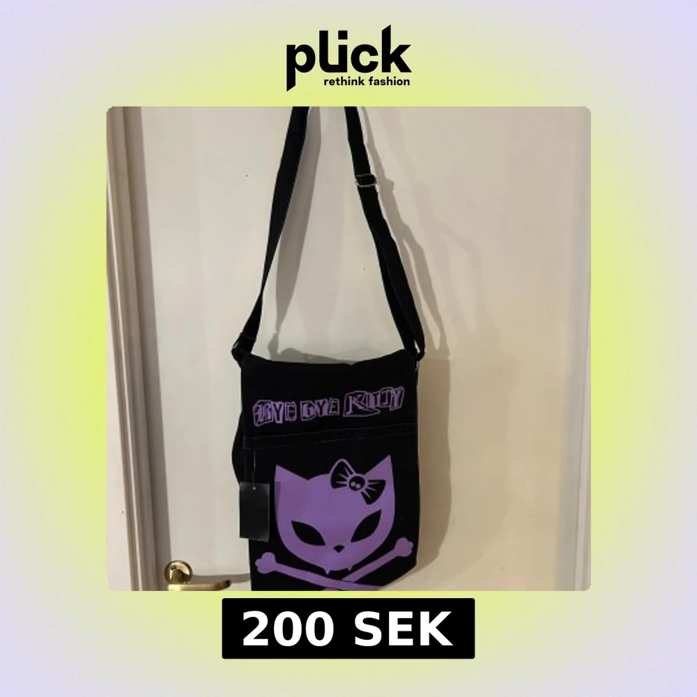 Cool svart axelväska med justerbar rem och ett unikt lila tryck av en katt med rosett och korsade benknotor. Perfekt för att ge en edgy touch till din outfit.