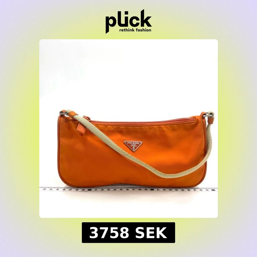 Snygg orange axelväska från Prada med klassisk trekantig logga i metall framtill. Väskan har en ljusbeige axelrem i textil och stängs med dragkedja. Tillverkad i slitstark syntet med stilren, avlång form. Perfekt för dig som gillar färg och vill sticka ut.