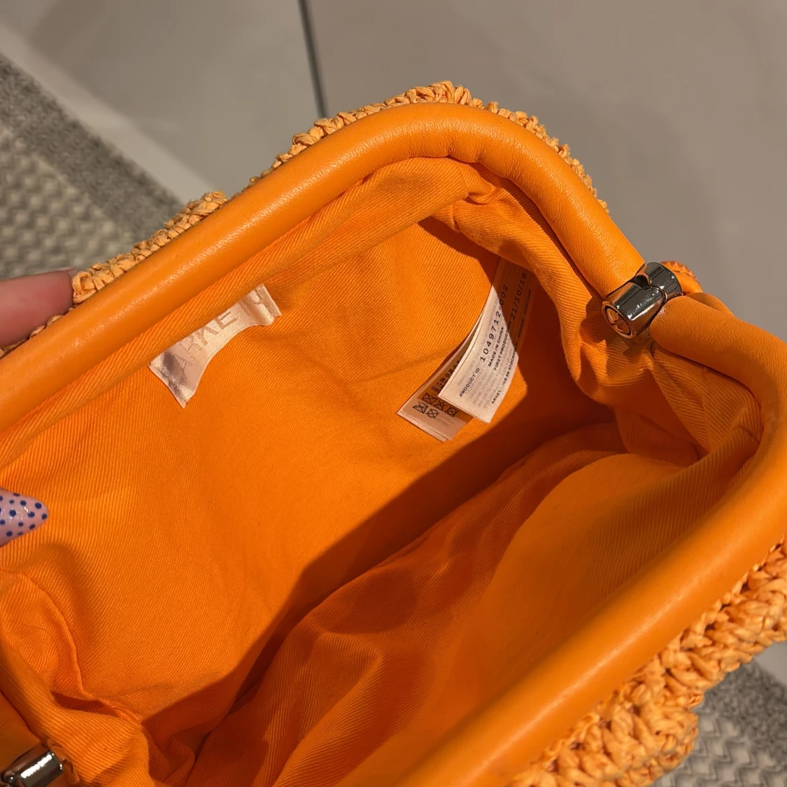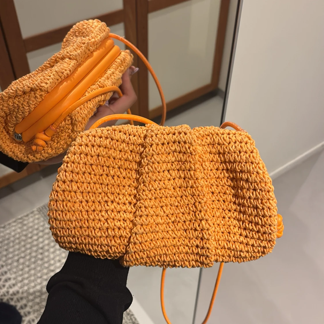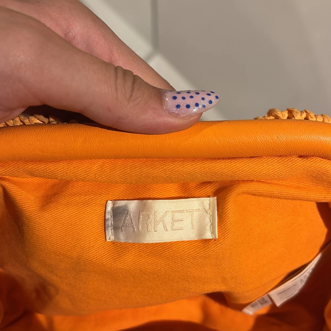 Säljer en superfin orange clutch väska från ARKET. Väskan är virkad med mjukt material och har en rundad form. Den har smala axelband och ett snyggt innerfoder i matchande orange tyg. Perfekt för att liva upp din outfit med en färgklick! (Nypris 1225 kr)