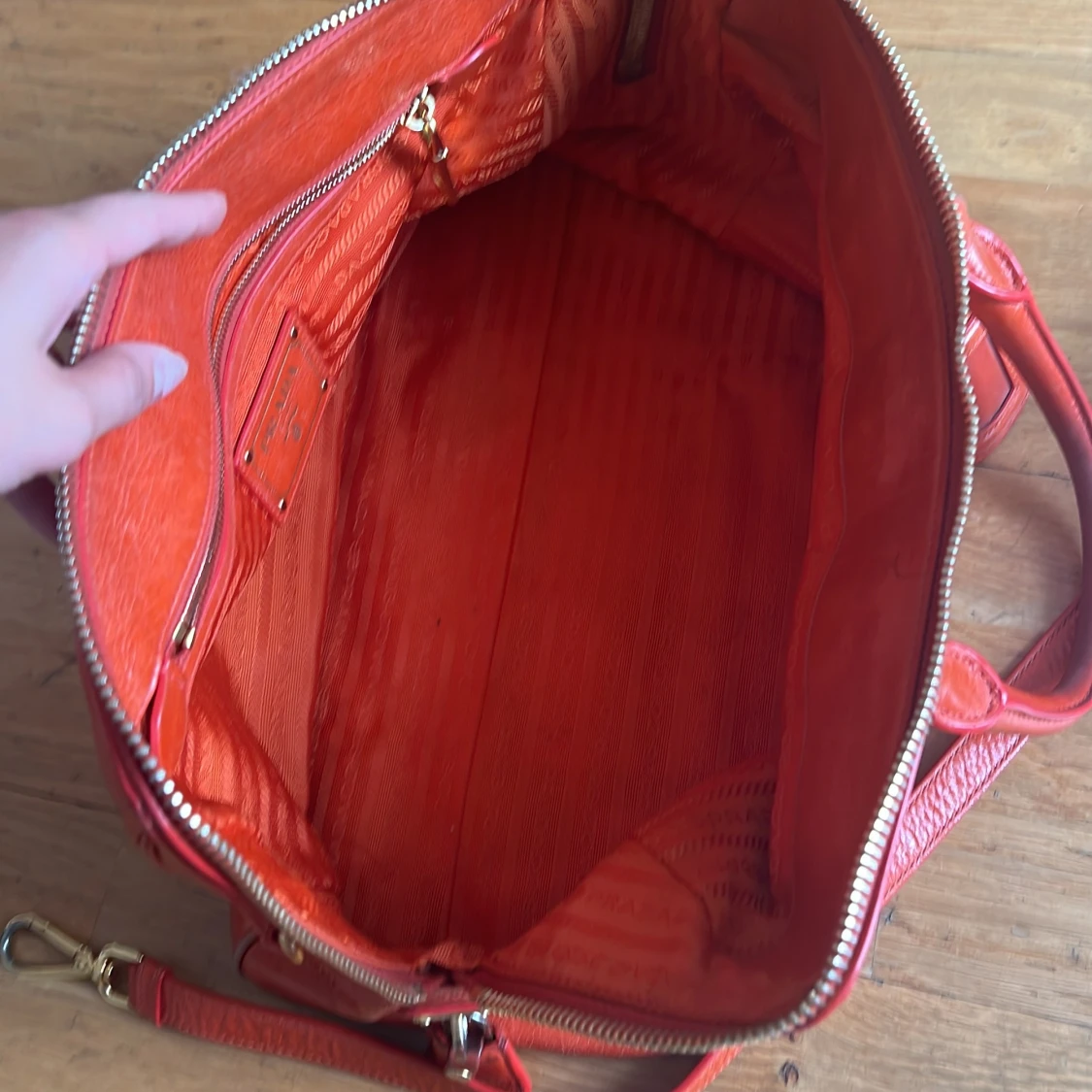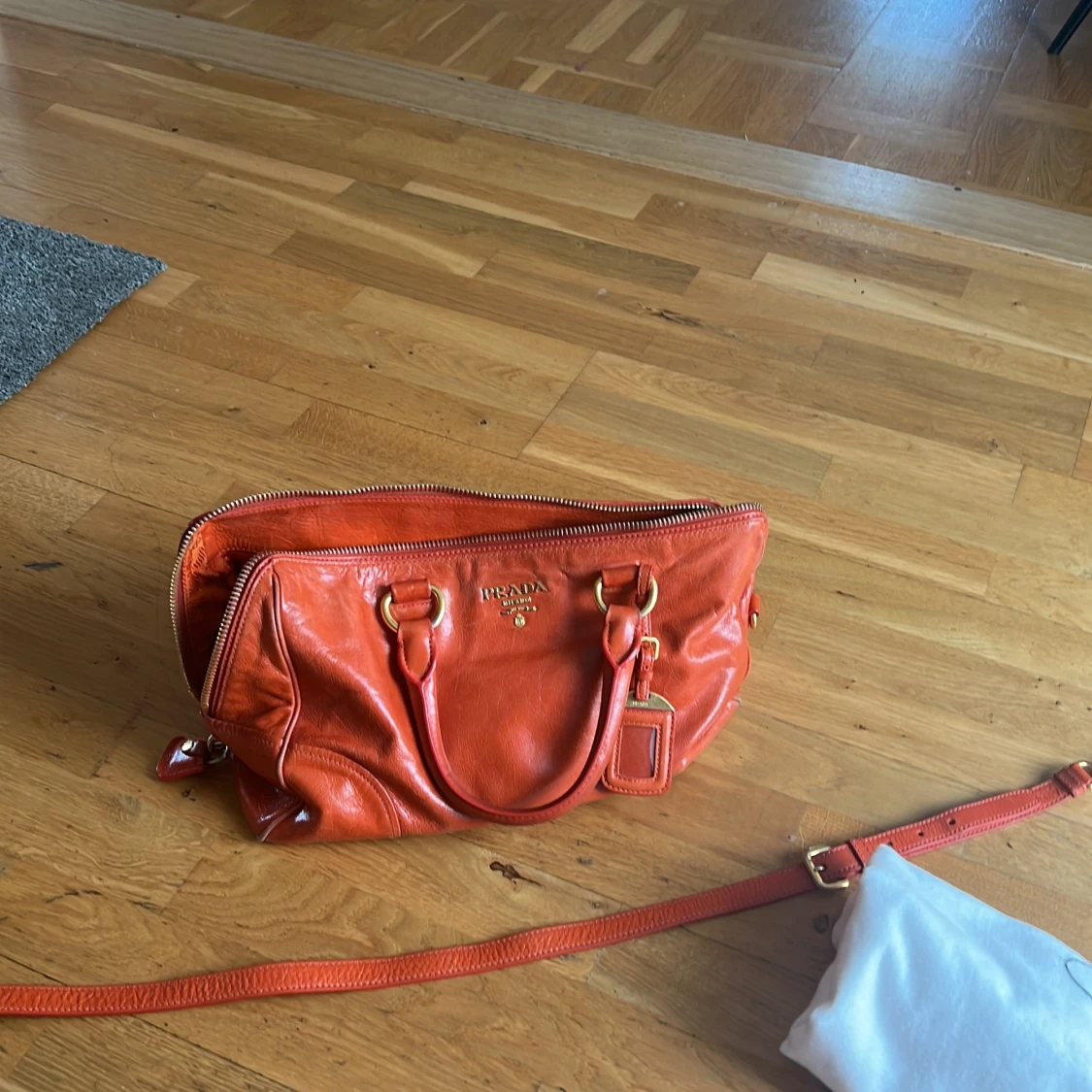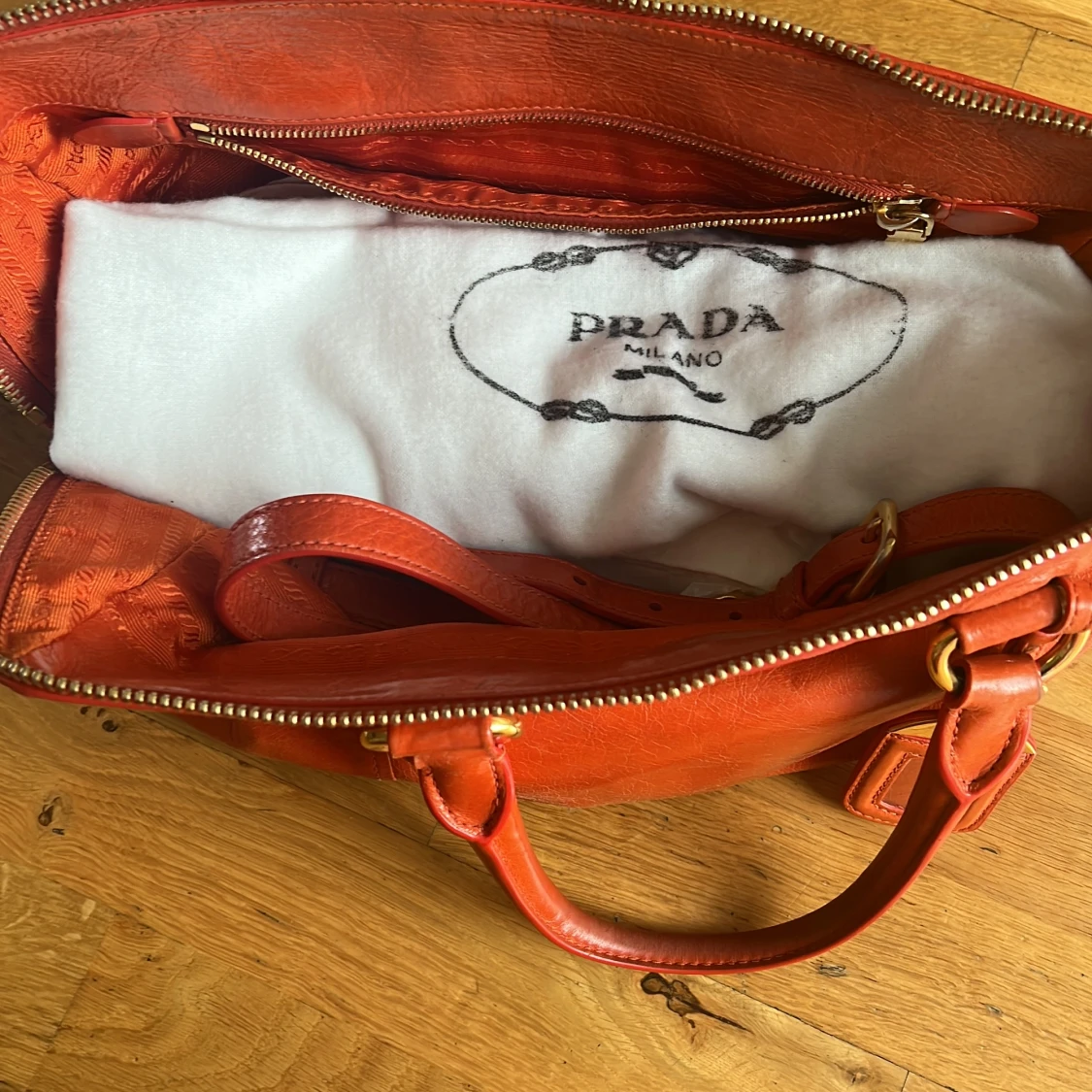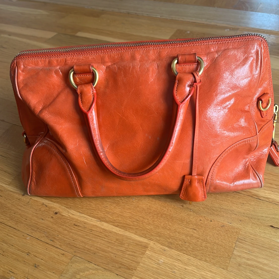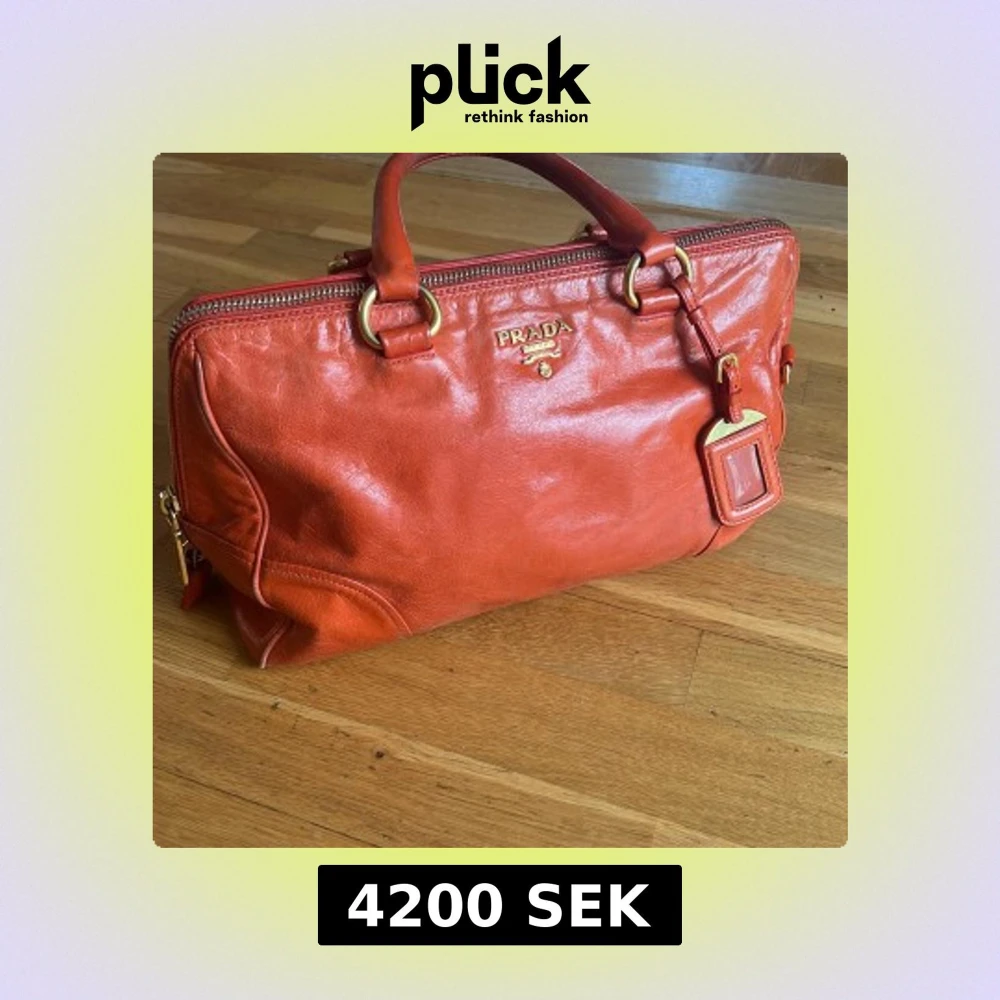 Säljer en snygg orange handväska från Prada i äkta skinn med guldiga metalldetaljer och dragkedja. Väskan har dubbla handtag, avtagbar axelrem och klassisk Prada-logga framtill. Perfekt för dig som vill sticka ut med en färgstark accessoar.