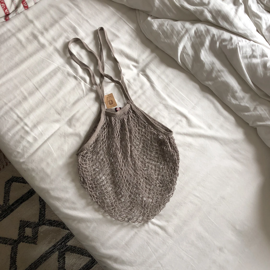 Stringbag i mörk beige/grå. Aldrig använd. Köpt i Danmark. 100% bomull. Mått: 35 x 70 cm.