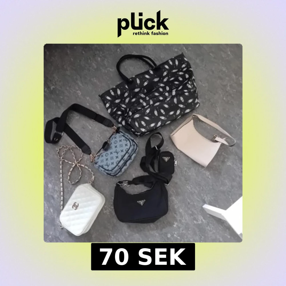 Säljer fem snygga väskor: en stor svart shoppingväska med fjädermönster, en ljusbeige axelväska i skinn, en vit quiltad handväska med kedja, en blå axelväska med monogram och en svart axelväska i nylon med dragkedja och extra liten pouch. Pr*adans dragkedja funkar ej, annars ska de vara hela, men i behov av en tvätt. Säljer billigt pga skicket och jag rensar hemma.