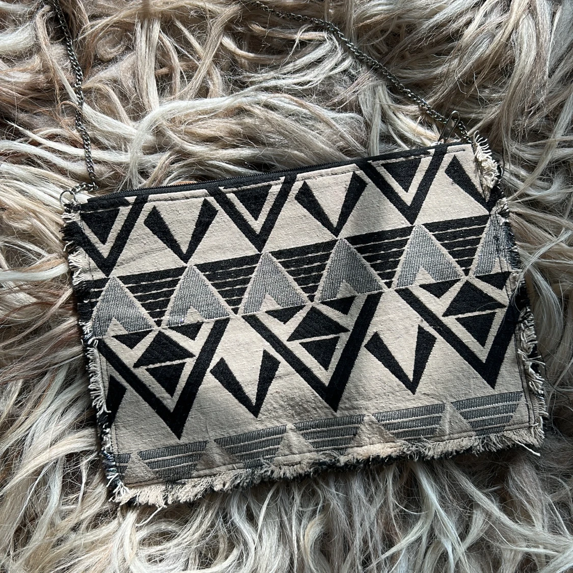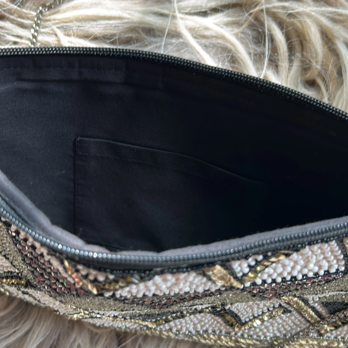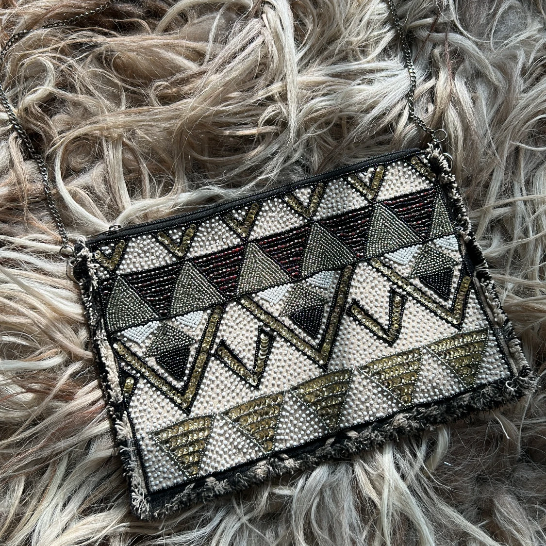 Kuvertväska med broderade pärlor och fransad kant. Kedjan kan tas av. ▪️Nyskick