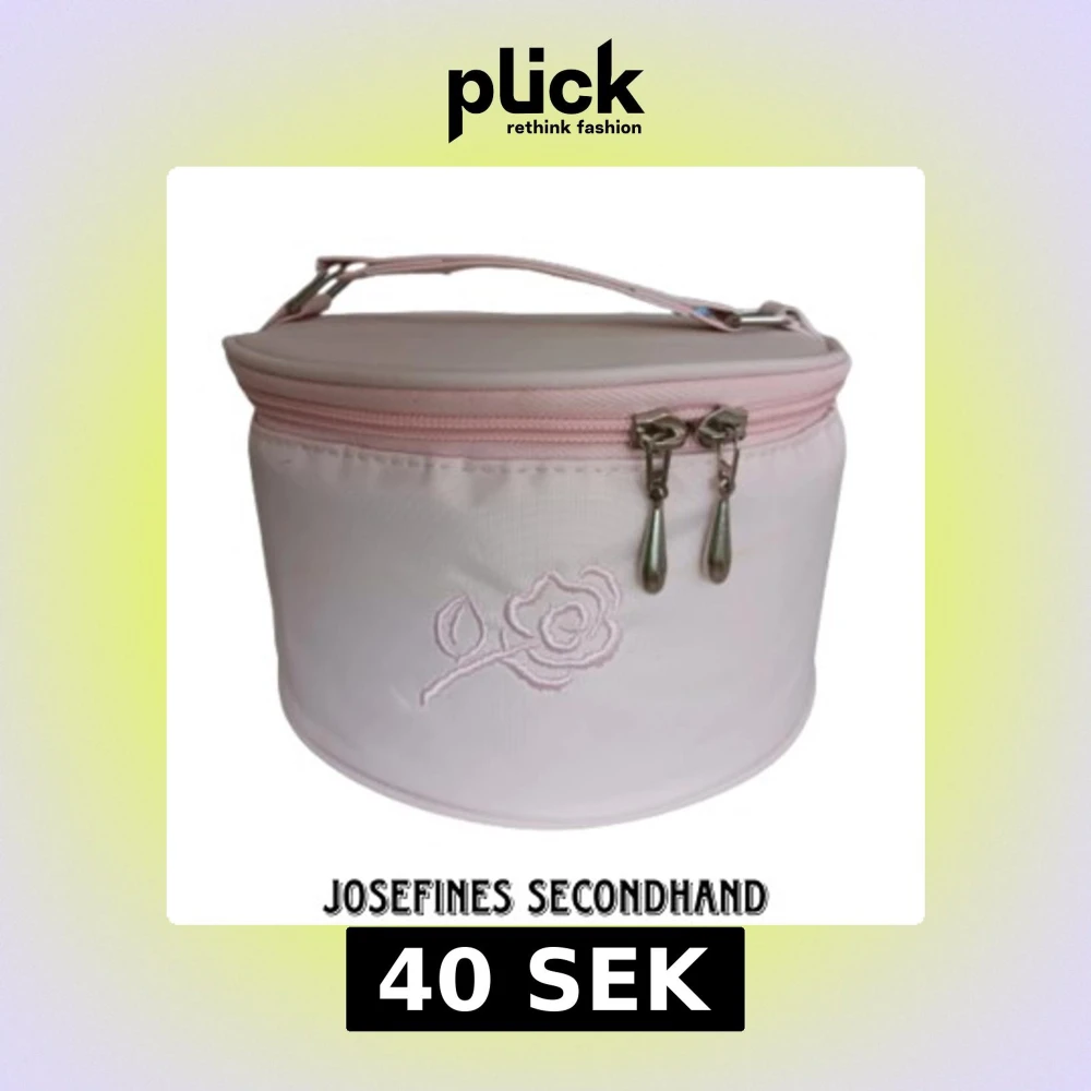 Rund rosa sminkväska med handtag, inre ficka och broderade rosor på. Har några fläckar men är i övrigt i bra kvalité