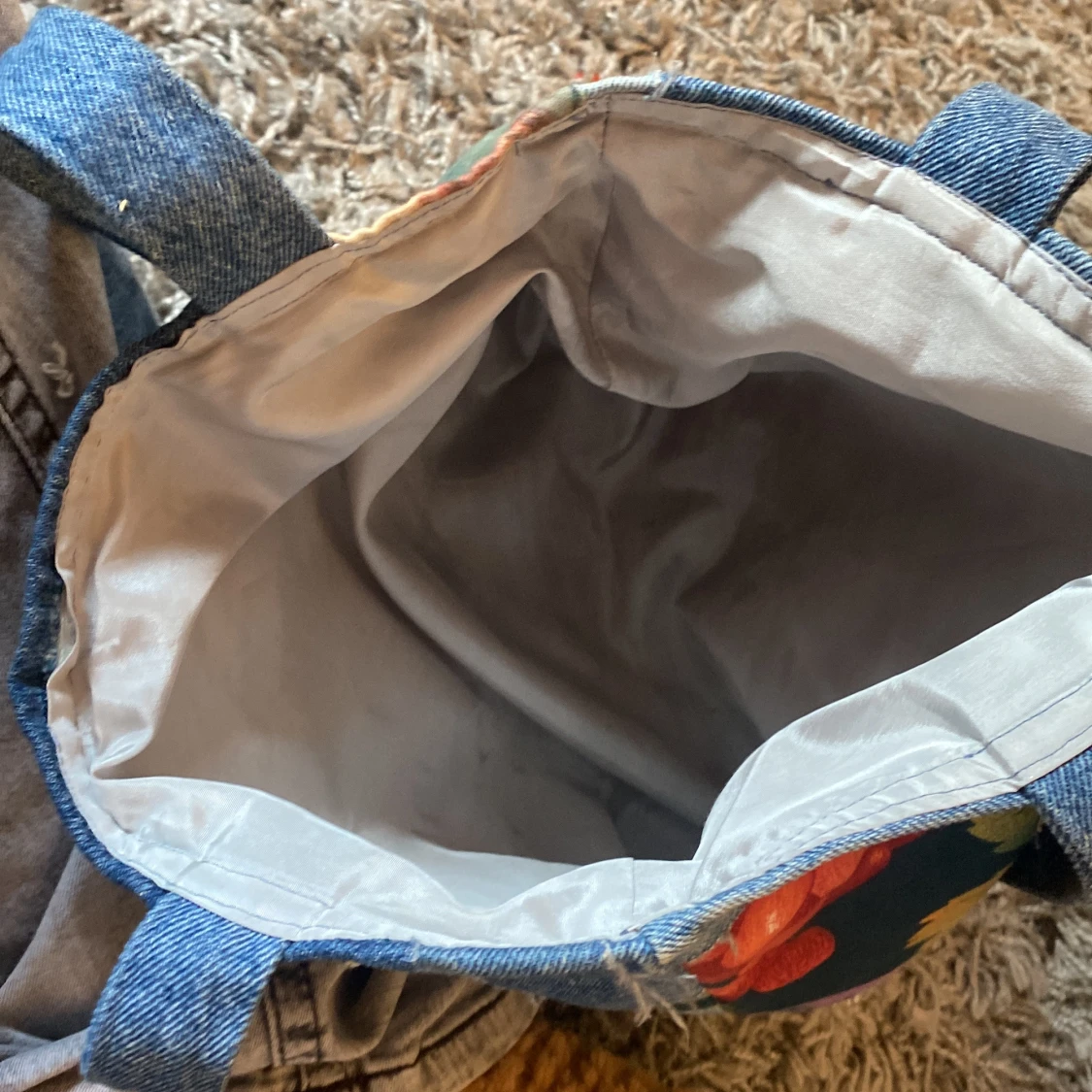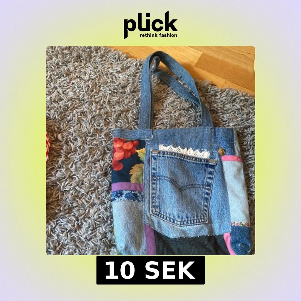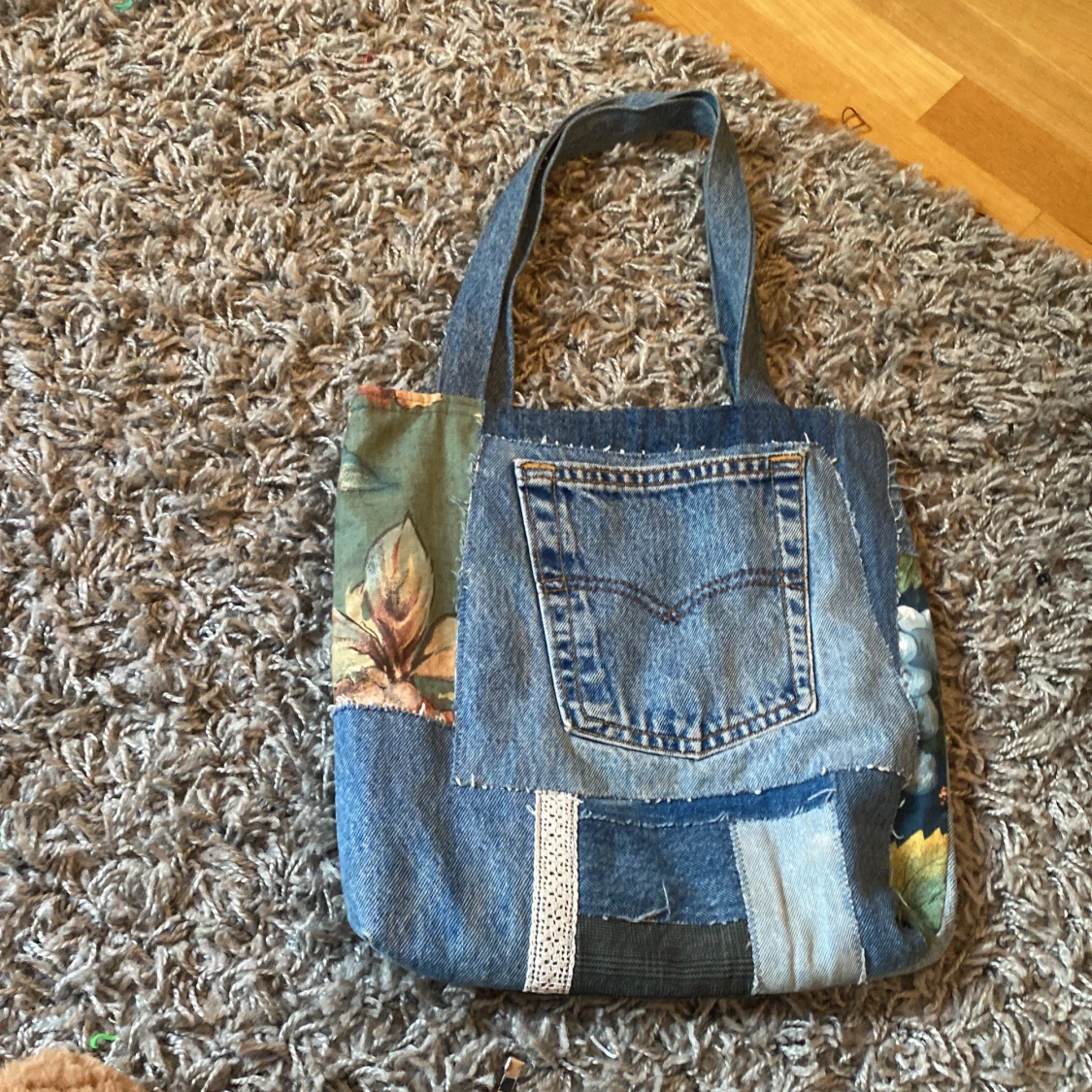 Unik shoppingväska i patchwork-stil med jeansdetaljer, ficka framtill och blommiga tyginslag i grönt, blått och rött. Perfekt för dig som gillar färg och personliga accessoarer. Nypris:vet ej