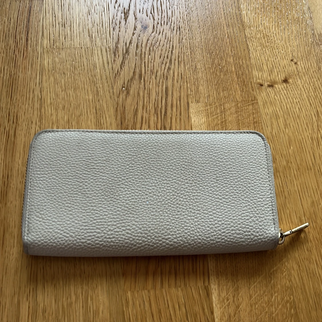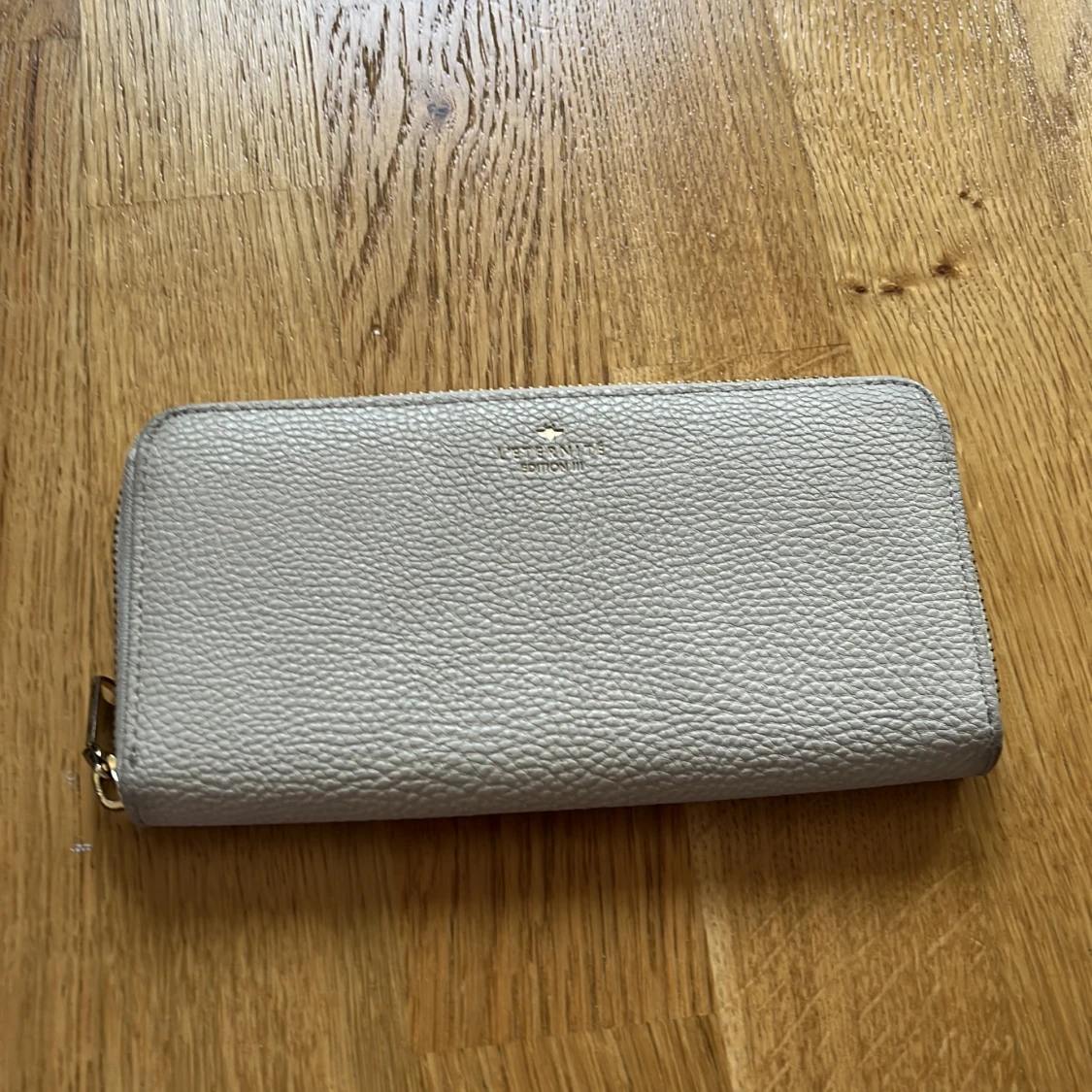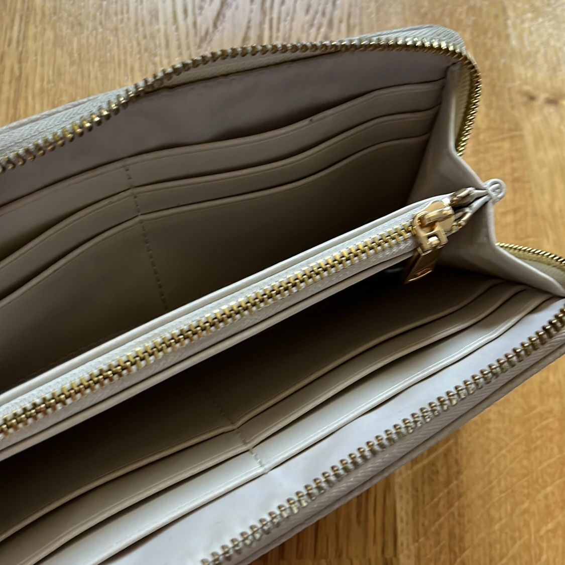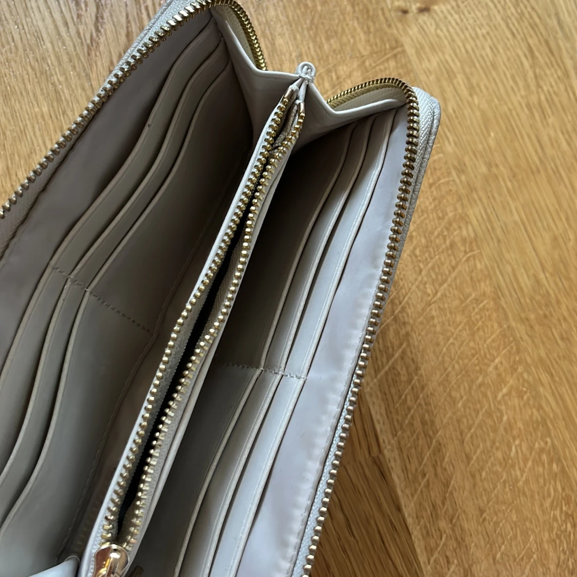 Stor beige plånbok med 12 fickor för kort och en ficka för mynt så är mer som en kuvertväska. Har blivit sparsamt använd.