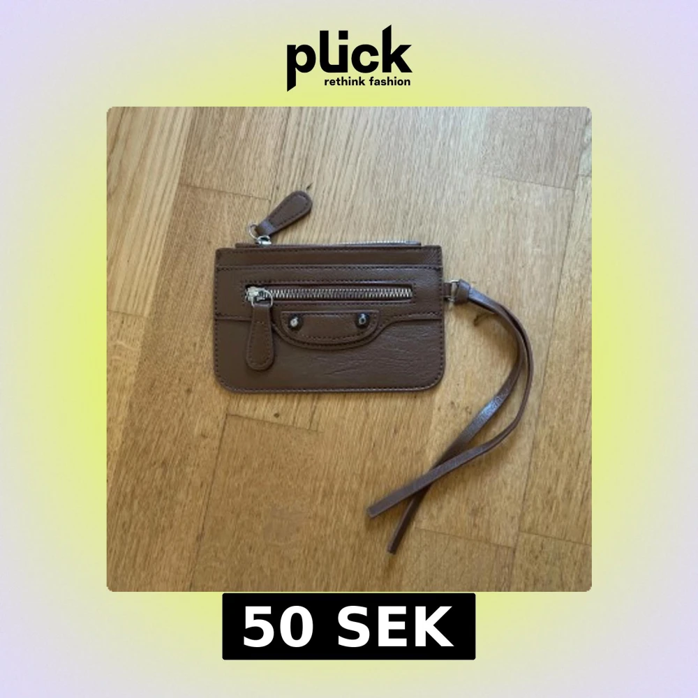 Snygg brun plånbok i skinn med dragkedja och handledsrem. Perfekt för att hålla dina kort och kontanter säkra. Den har en stilren design med silverdetaljer och knappar.