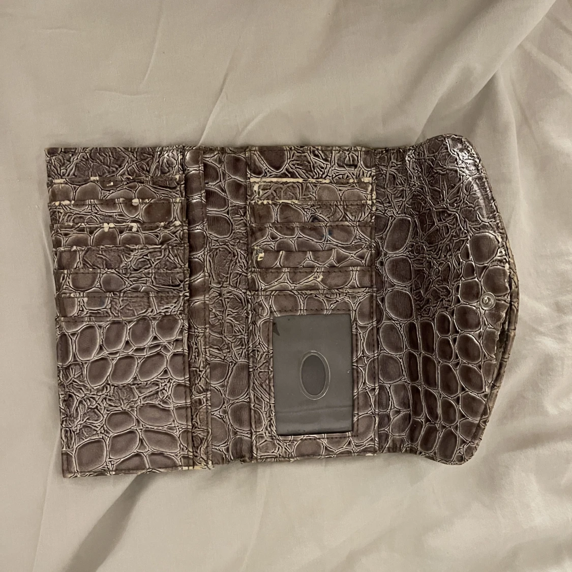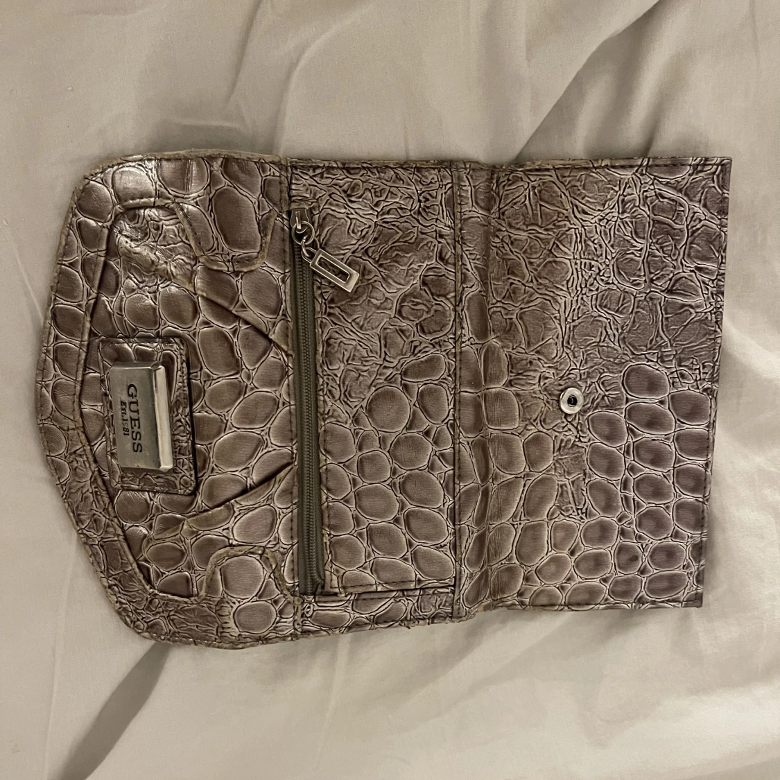 Guess plånbok i ormskinn i en brun beige färg med silverdetaljer:)