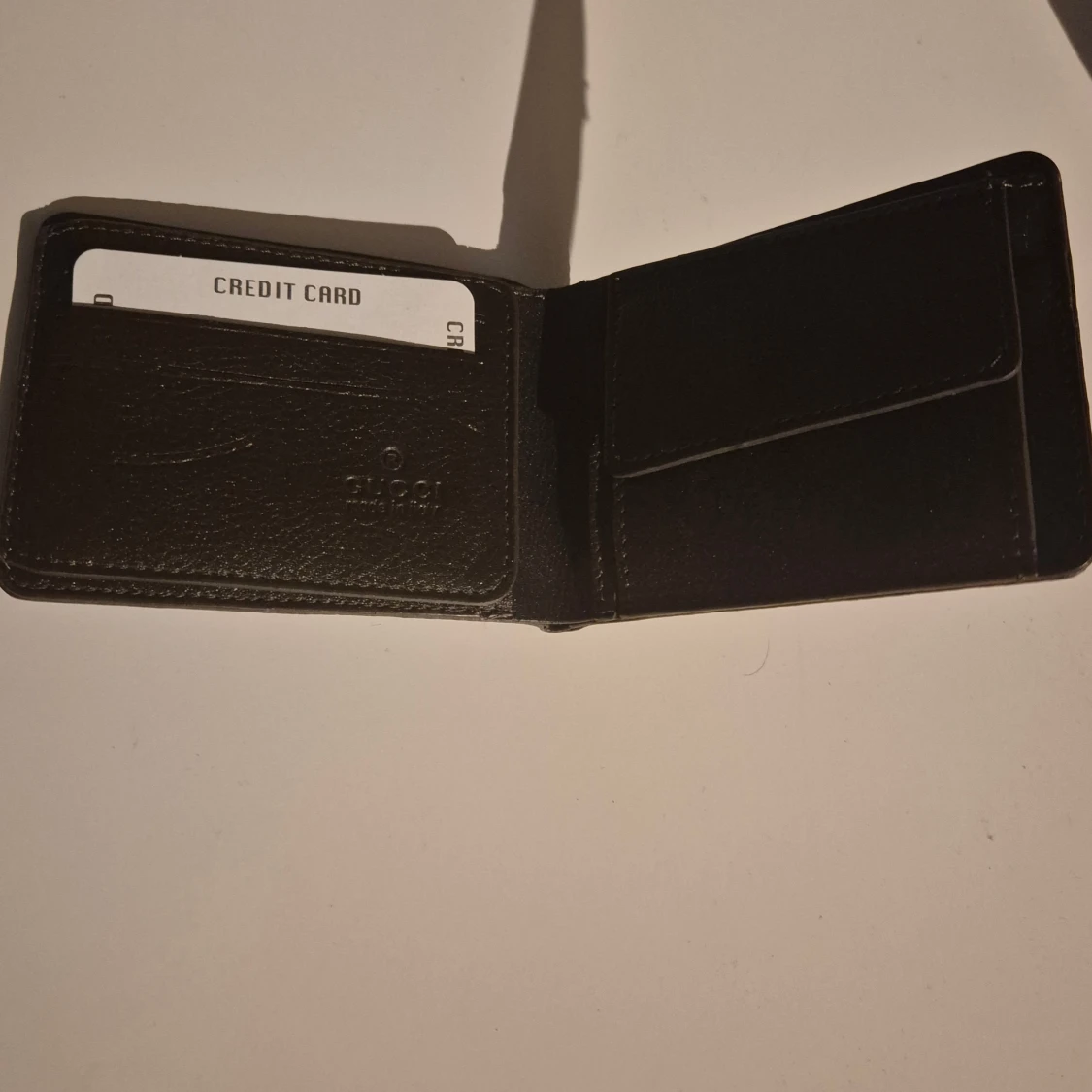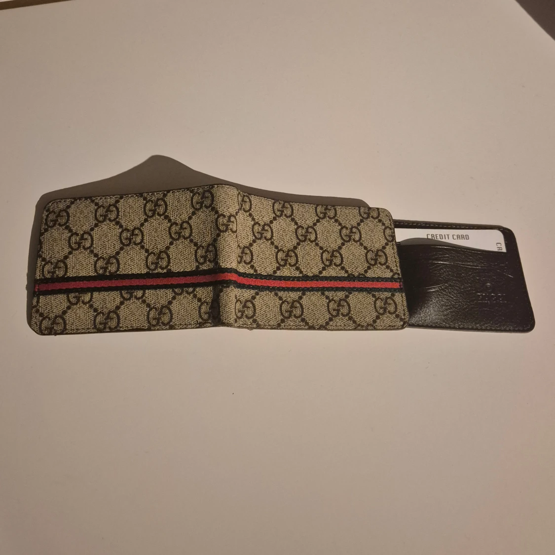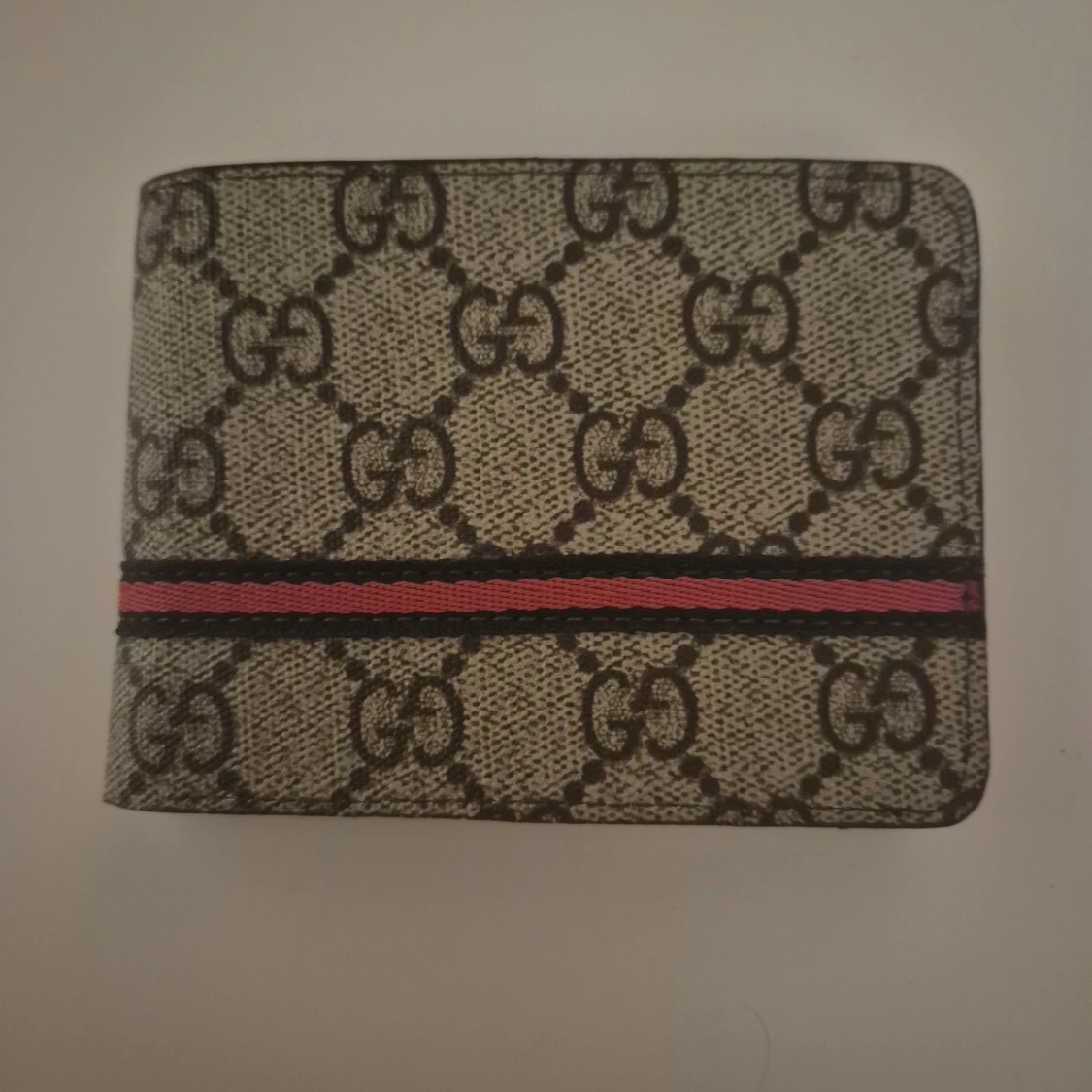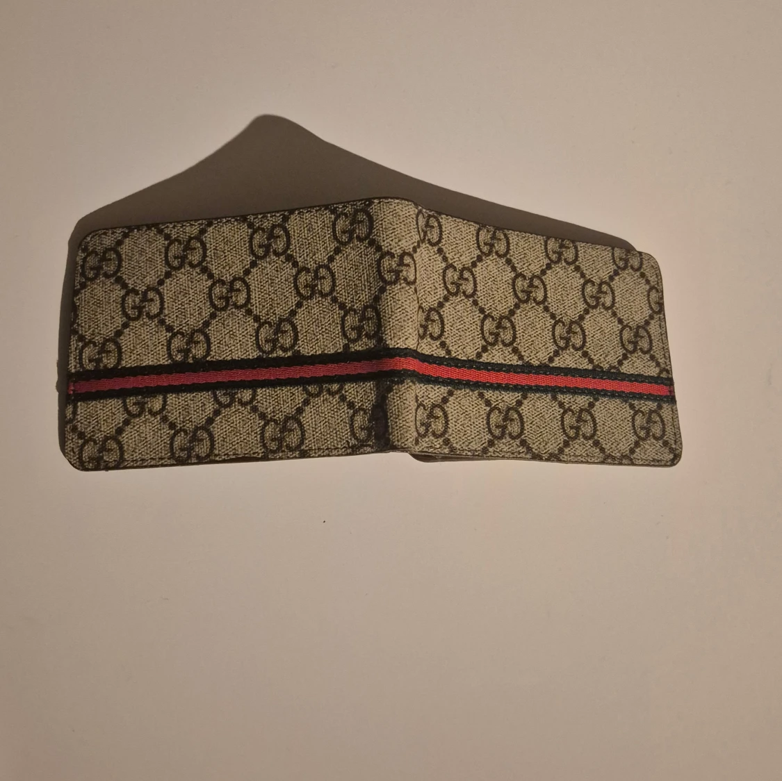 Snygg plånboki med klassiskt GG-mönster i beige och brunt. Utsidan har en röd och svart rand som ger en extra touch. Insidan är mörkbrun med plats för kort och sedlar. Perfekt accessoar för dig som gillar lyxiga detaljer.