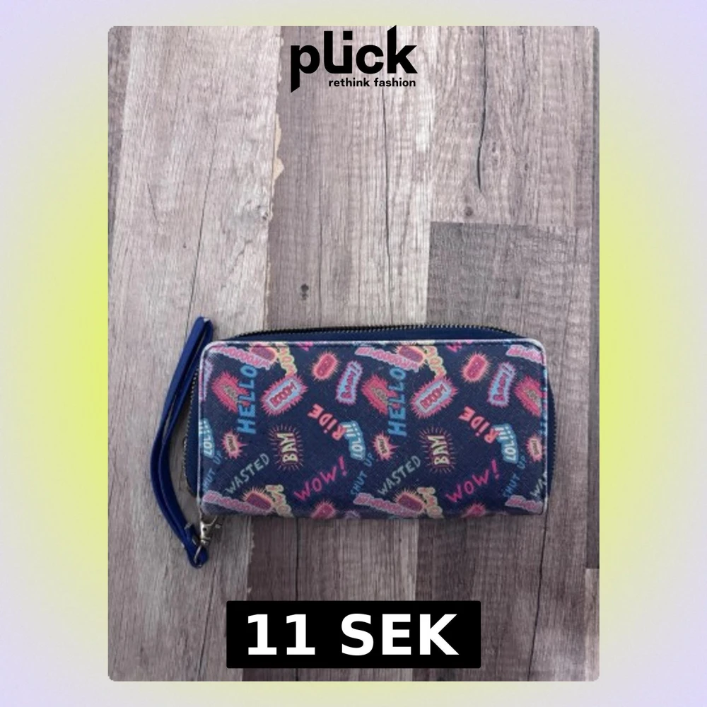 Cool plånbok med pop art-inspirerat tryck i färger som blått, rosa, gult och rött. Plånboken har dragkedja runtom och en blå handledsrem. Text som 'HELLO', 'WOW!' och 'LOL!' ger en lekfull vibe. Materialet känns som konstläder.