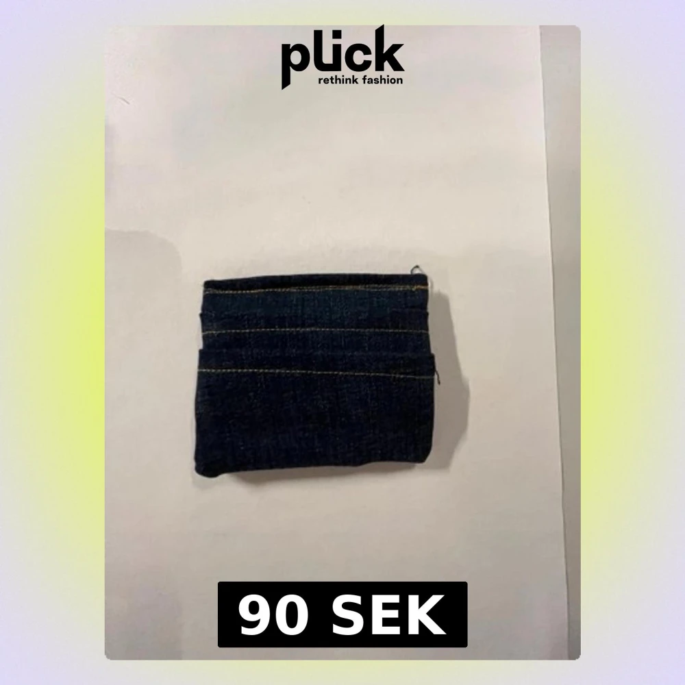 Säljer en liten och smidig plånbok i mörkblått jeanstyg med synliga kontrastsömmar. Perfekt för kort och småmynt, enkel design med flera fack. Plånboken har en rektangulär form och är gjord av denimtyg.