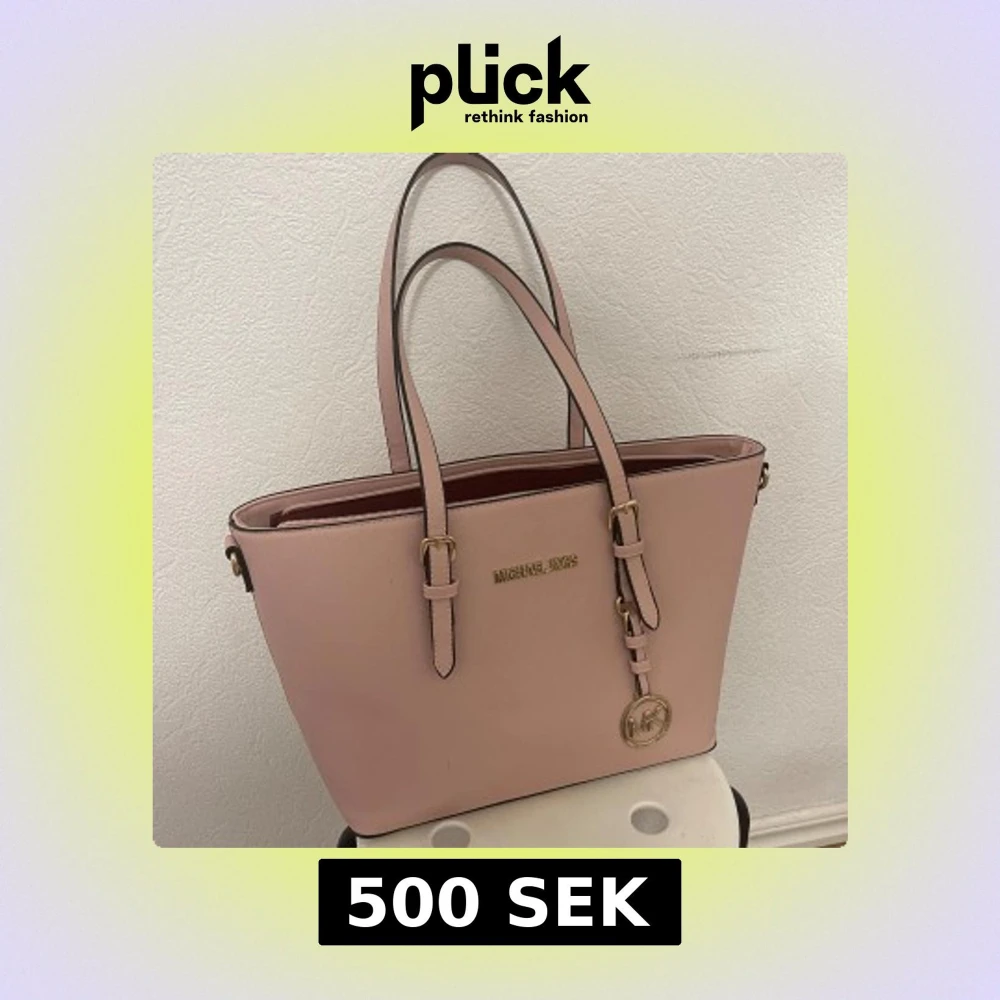 Säljer en snygg ljusrosa handväska från Michael Kors med guldfärgade detaljer och MK-hänge. Väskan har två långa handtag, flera innerfack och dragkedja upptill. Utsidan är i skinn och insidan är fodrad i vinrött tyg. Perfekt storlek för allt du behöver ha med dig.