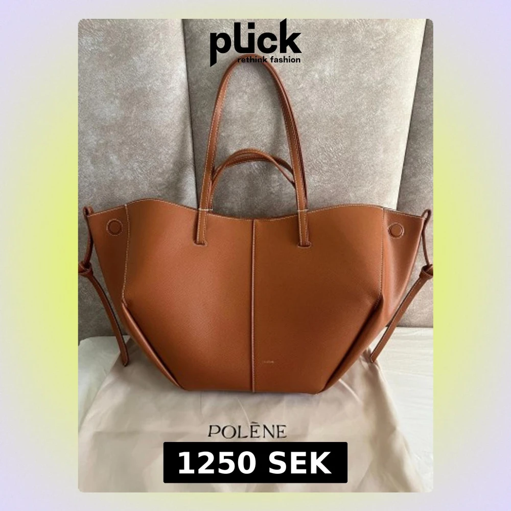 Säljer en snygg handväska från Polène i brunt skinn med unik geometrisk form. Väskan har två långa handtag, vita kontrastsömmar och magnetlås. Insidan är rymlig med en innerficka och ljus textil. Perfekt för dig som gillar stilrena accessoarer.