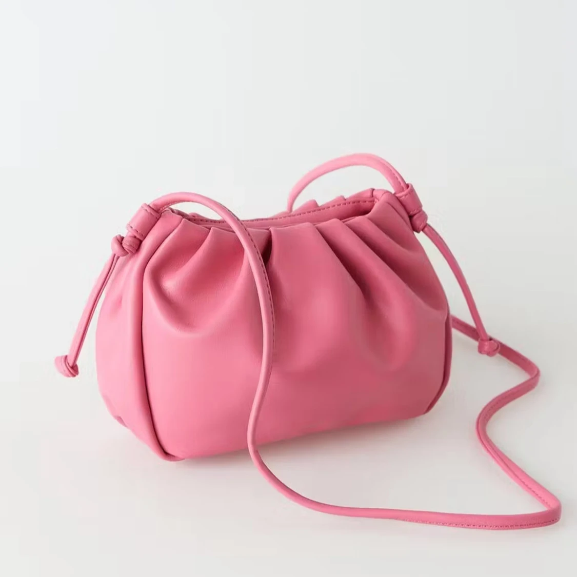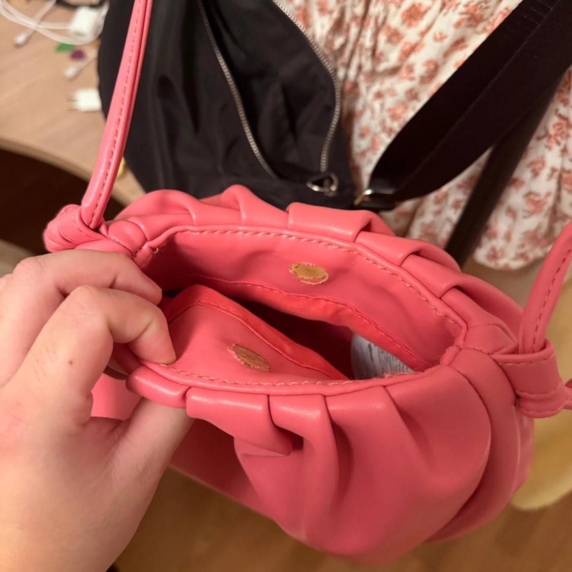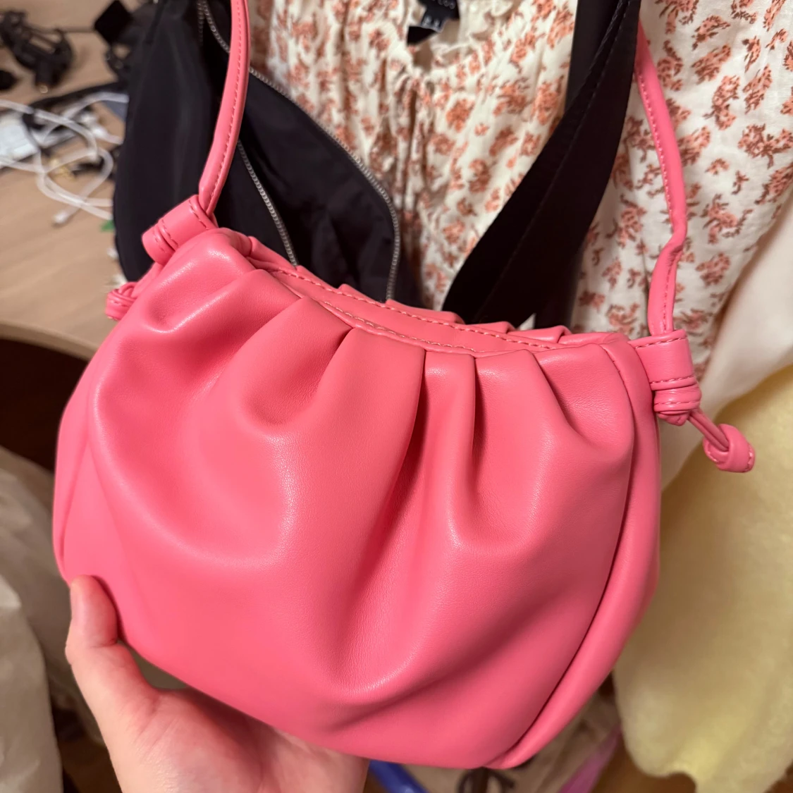 Superfin rosa väska i PU med ett långt band som kan knytas till en kortare längd om man vill. Stängs med magnetlås, som förövrigt är lite sliten (se bild 3), men som inte stör så mycket eftersom det är på insidan 💖
