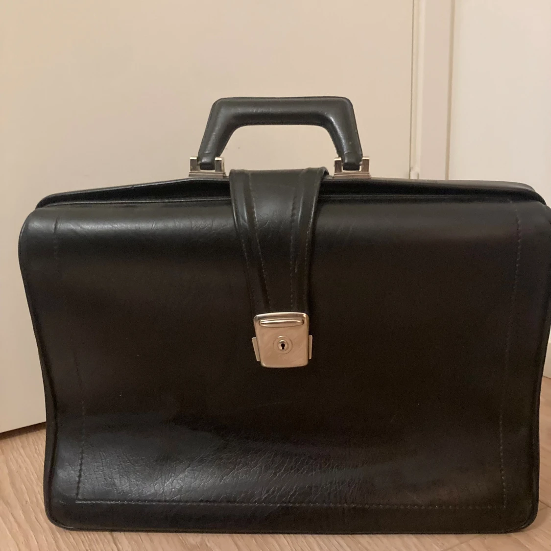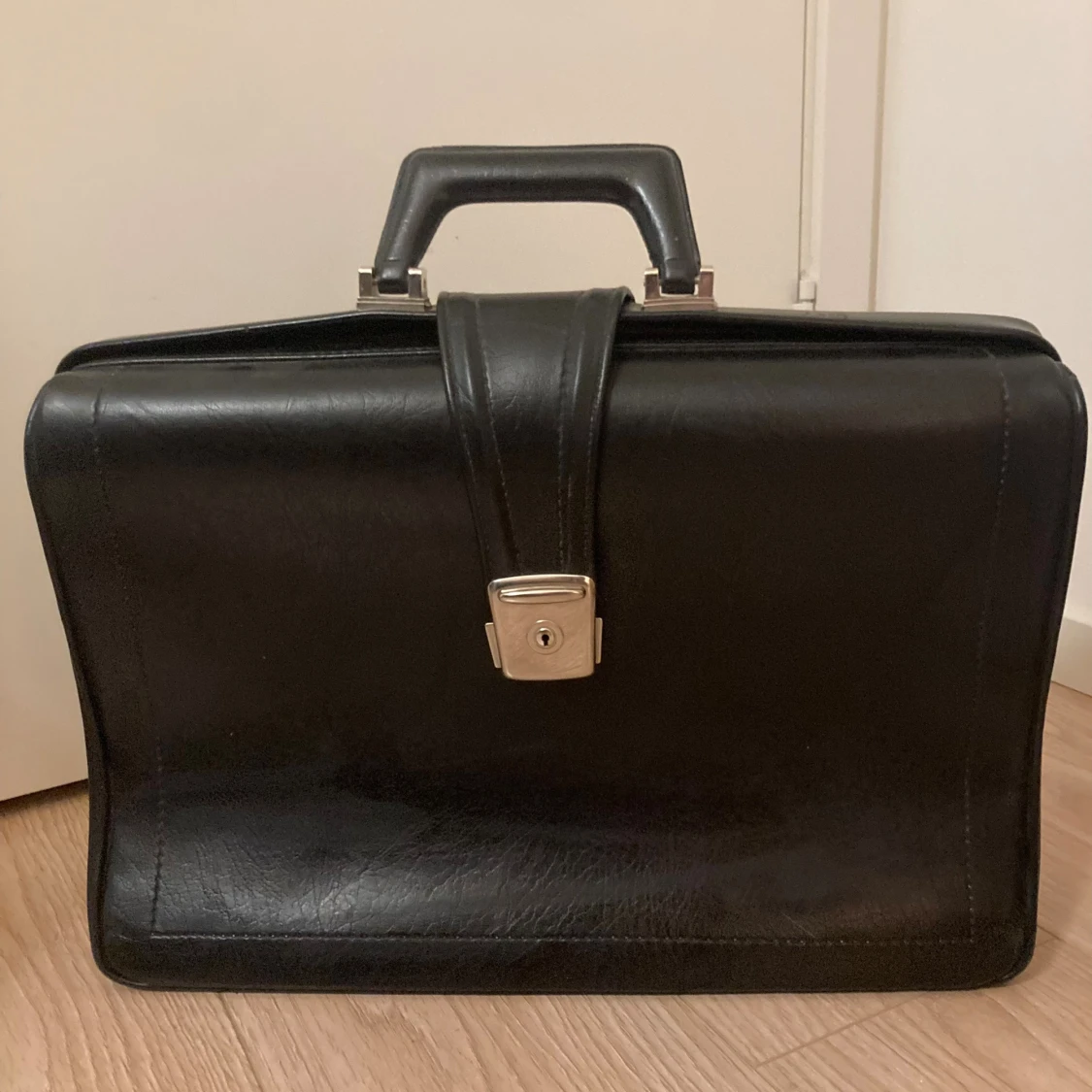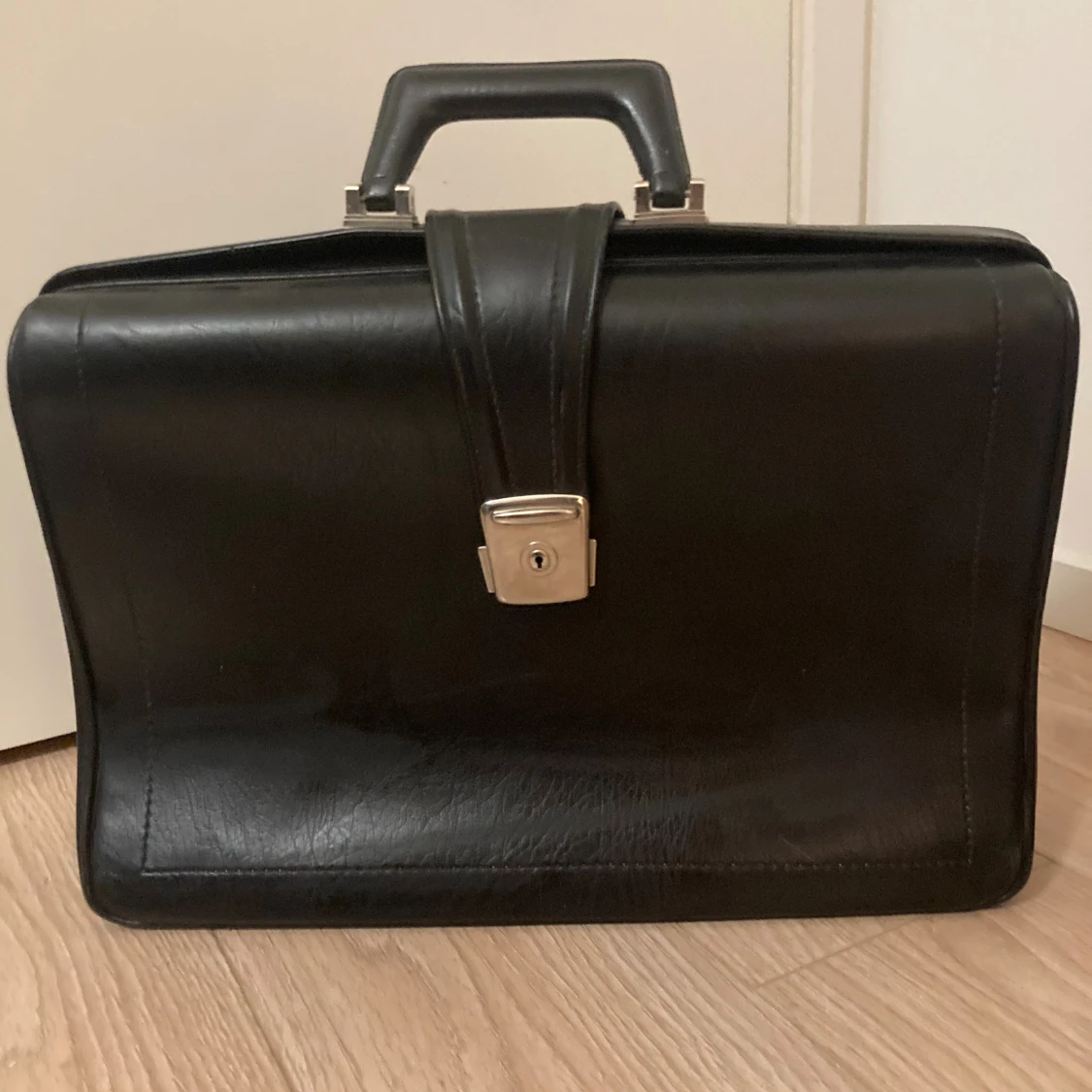 Klassisk svart portfölj i skinn med robust handtag och silverfärgat lås framtill. Stilren och tidlös design, perfekt för att bära dokument eller laptop. Väskan har en hård struktur och tydliga sömmar längs kanterna för extra stabilitet.