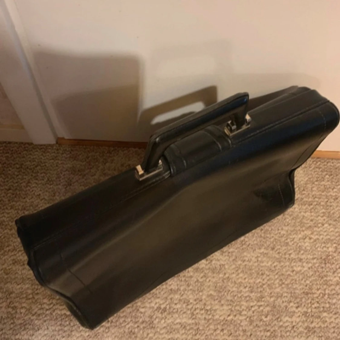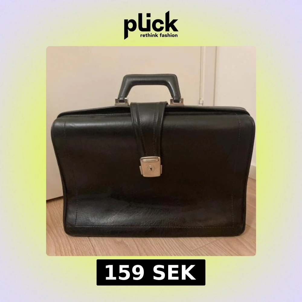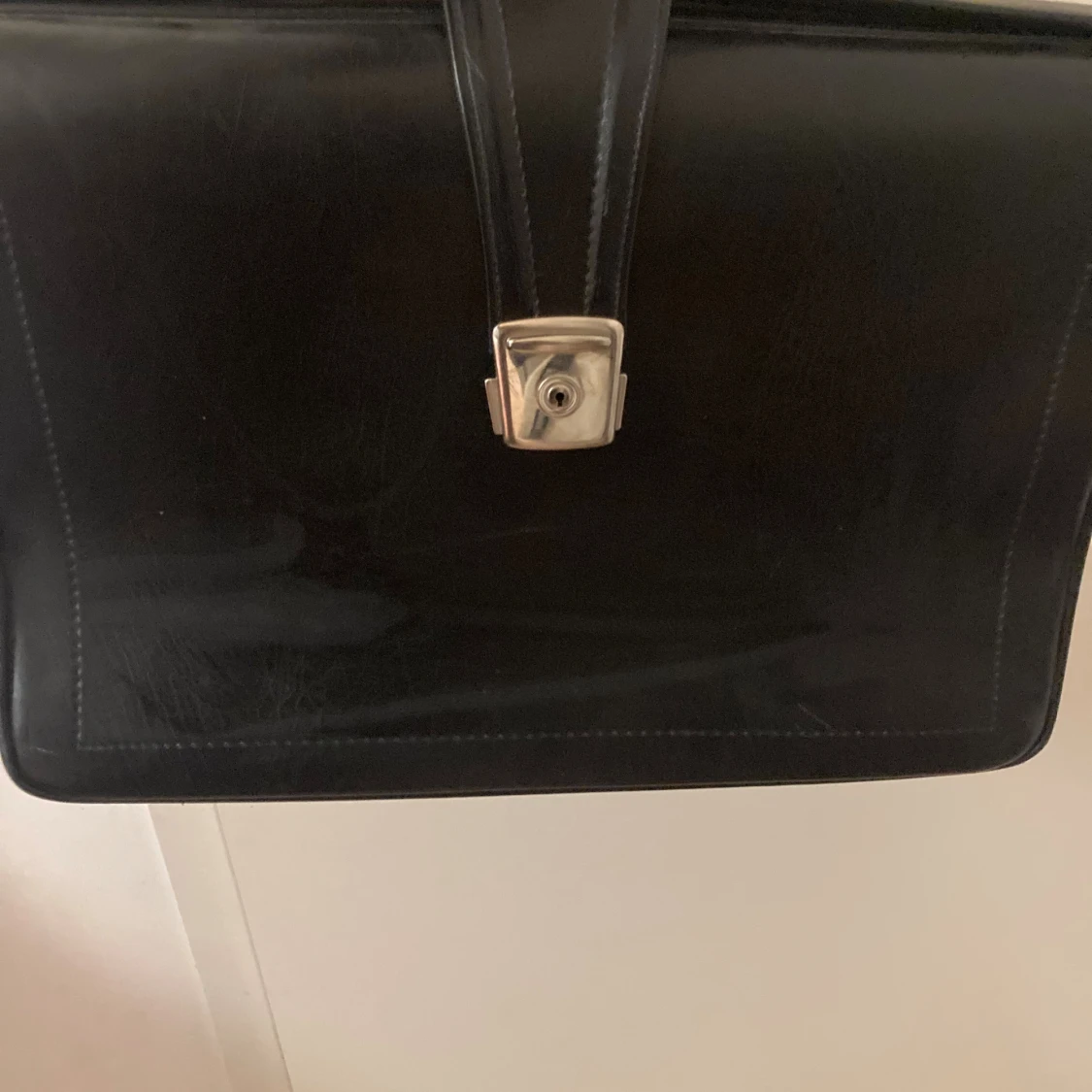 Klassisk svart portfölj i skinn med robust handtag och silverfärgat lås framtill. Stilren och tidlös design, perfekt för att bära dokument eller laptop. Väskan har en hård struktur och tydliga sömmar längs kanterna för extra stabilitet.